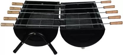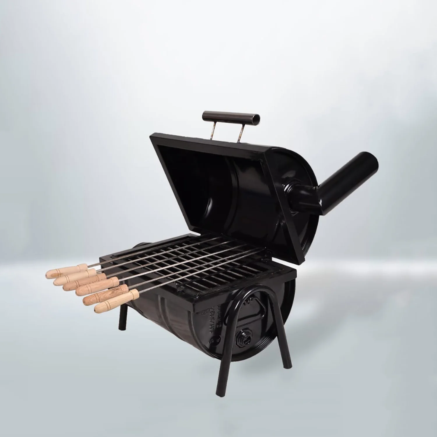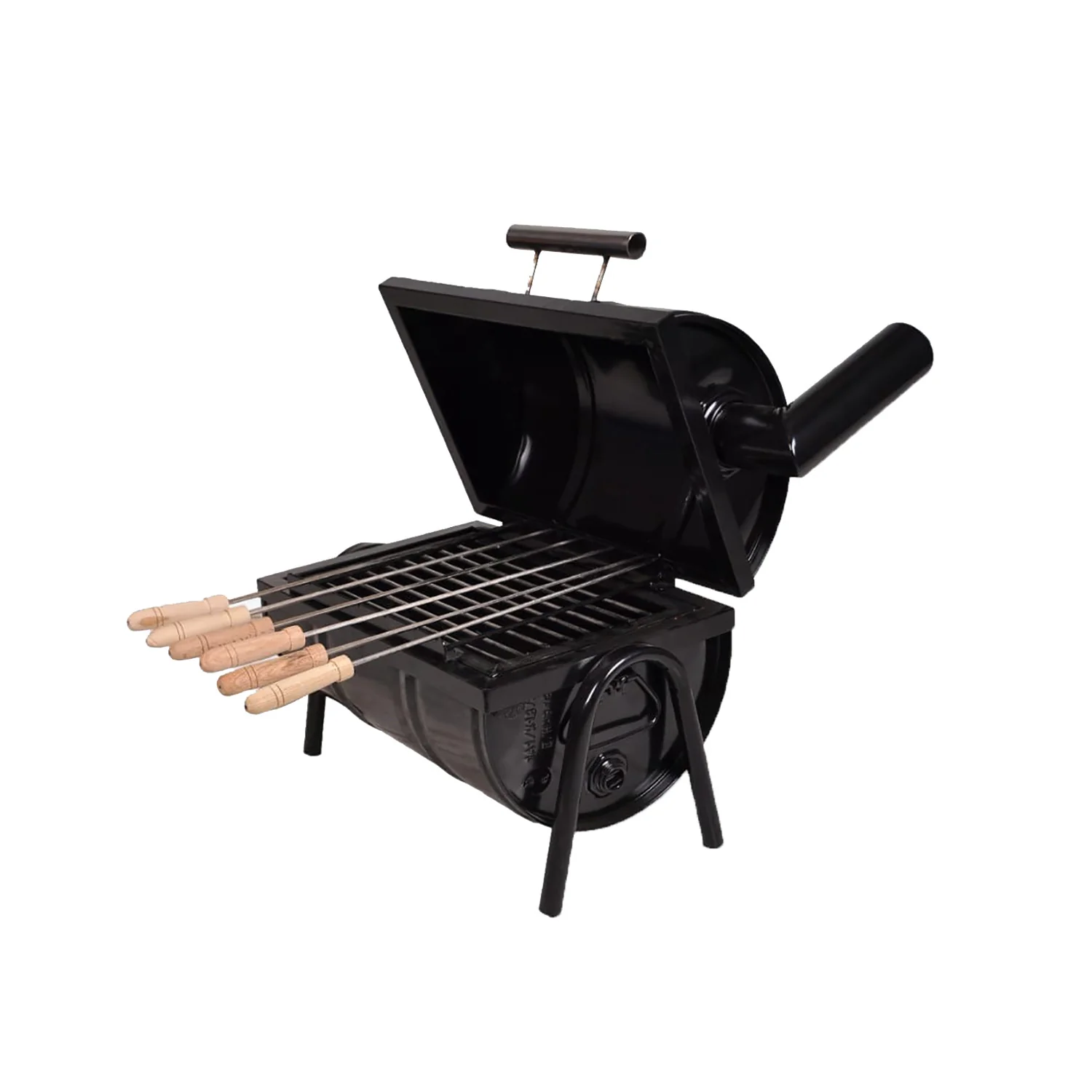 Ghazala Travel Grill: Dual-sided, foldable, 50×30 cm in size, with electrostatic thermal coating, equipped with 2 stainless steel grills, 2 charcoal drawers, 12 skewers, and a free fan with blades.