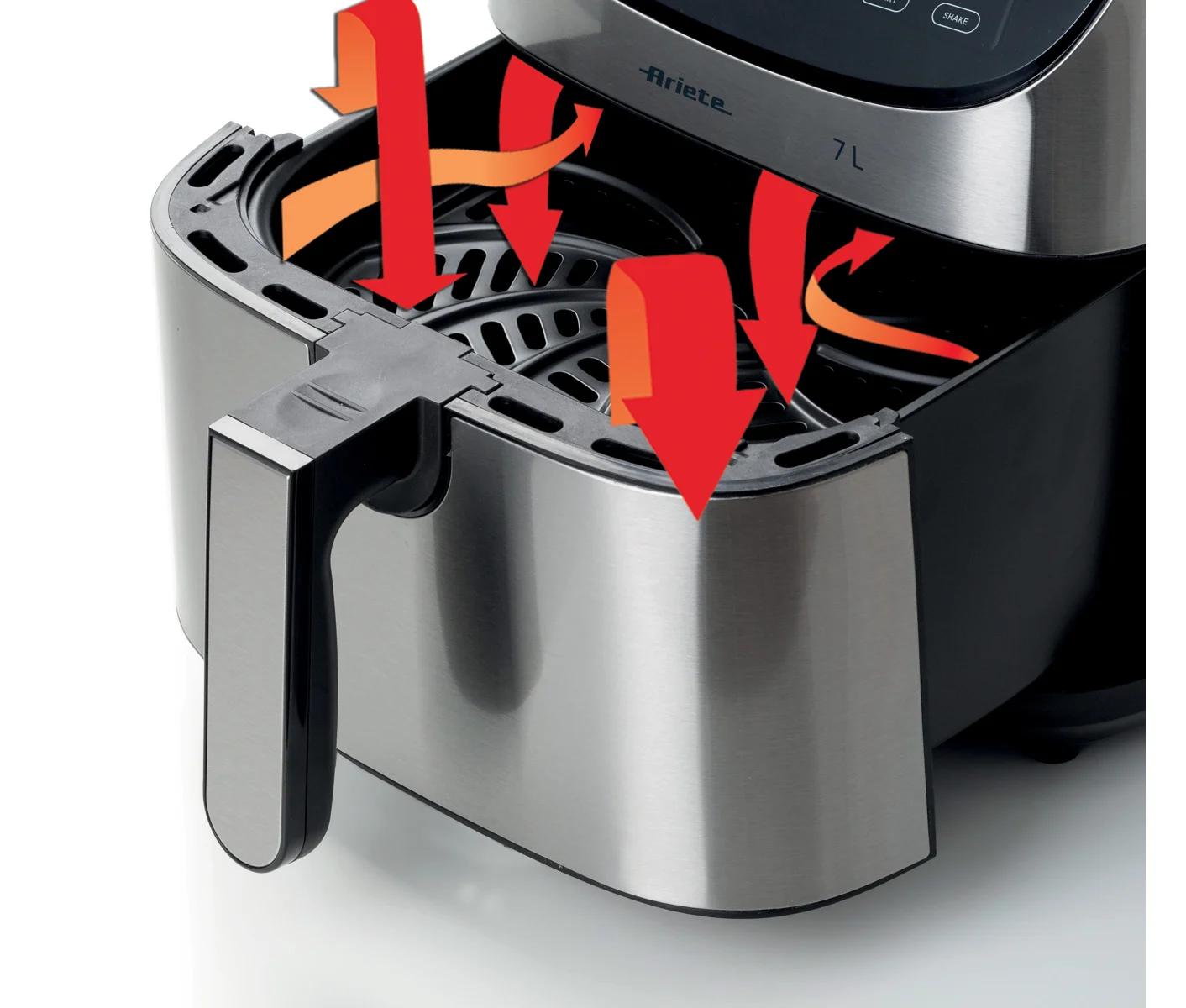 From the large touch screen panel you can adjust cooking times, programs, temperatures and timers. Airy Fryer Metal 7L features the Max Crisp function: thanks to the special grid that positions the food raised inside the air chamber, the cooking of the food will be more crunchy in just a few minutes. Airy Fryer Metal 7L has 2 pluses: the heating function and the shake signal. The latter indicates when it is necessary to turn the dishes inside the basket in order to optimize cooking. Frying is right in your hands!