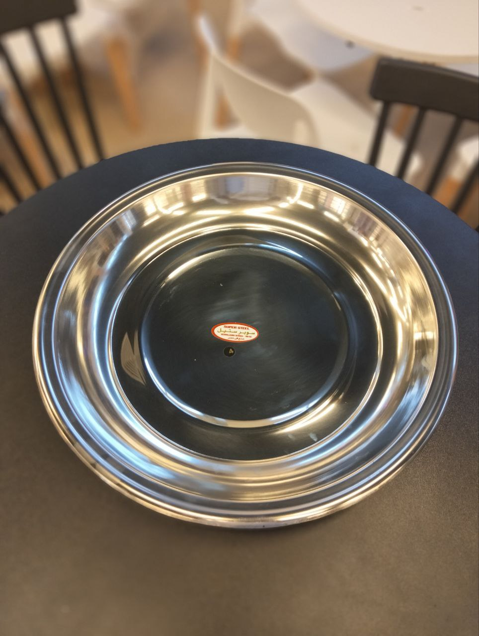 "Large stainless steel serving tray, size 4, Super Steel brand."