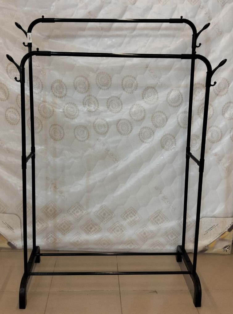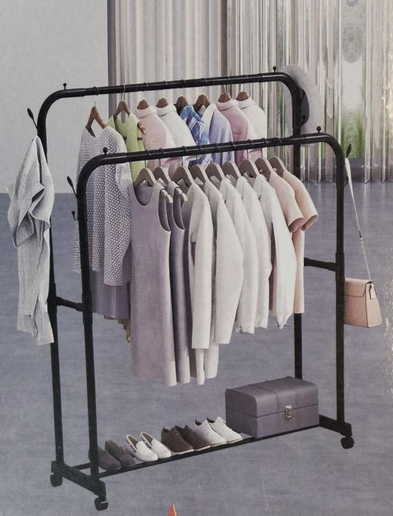 Black double-rod metal clothes rack with high capacity multiple side hooks and wide lower shelf equipped with wheels for easy transport ideal for efficient and elegant organization