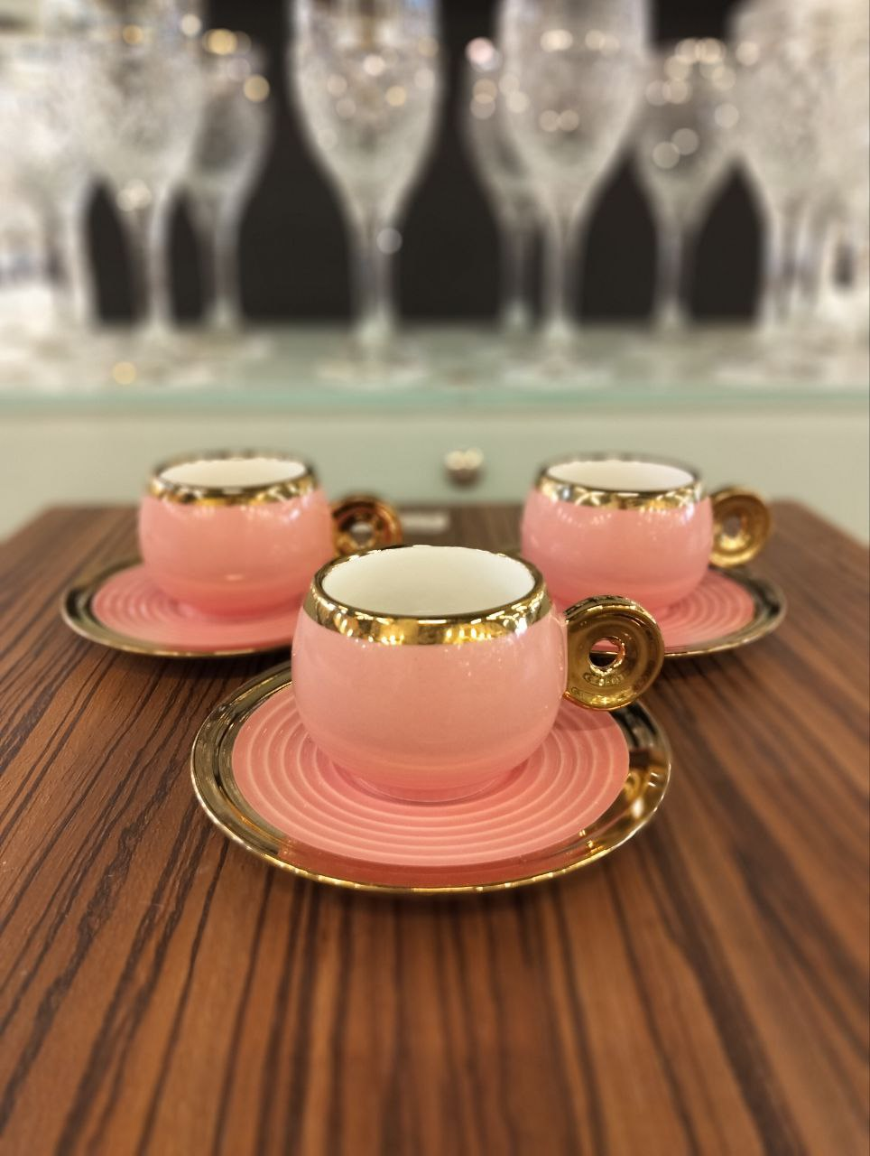 Coffee cup set of 6 pieces with saucers, creamy gold color with swirl pattern, code A138 - 2