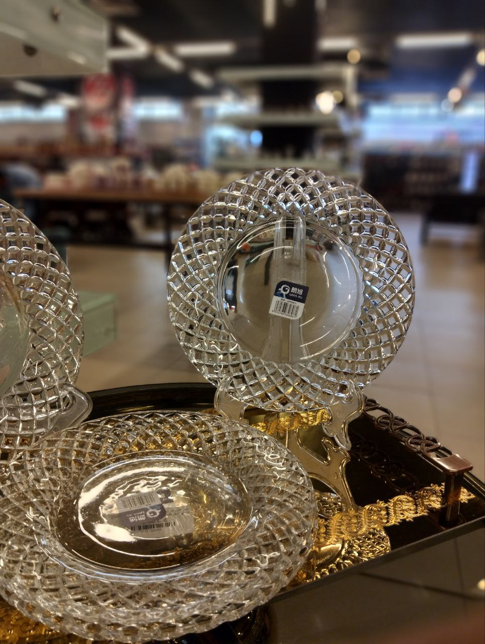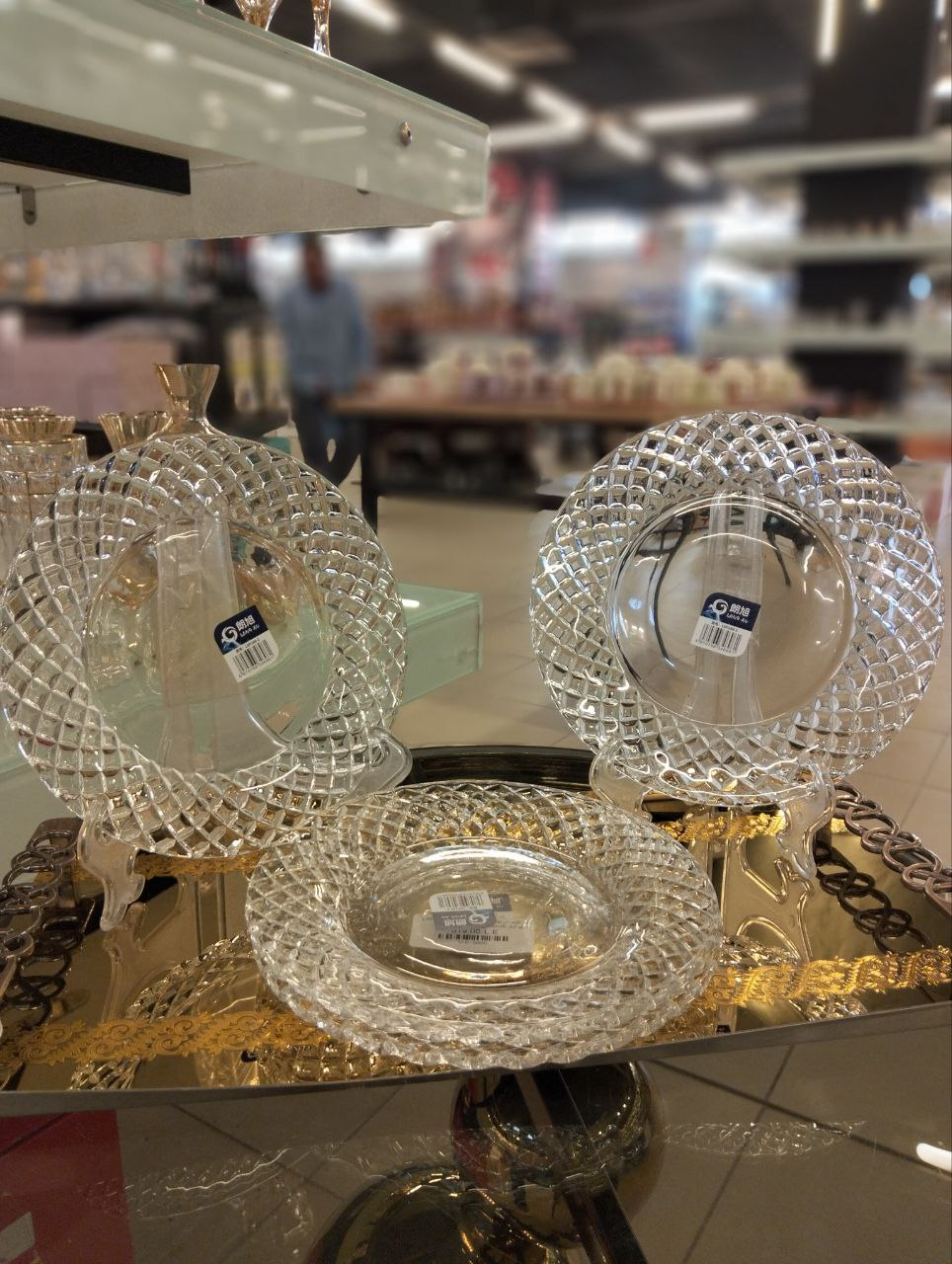 Living Home glass serving plate set, 4 pieces, elegant round design with classic embossed diamond-like patterns that reflect light luxuriously. Perfect for serving or as a stylish decorative piece in