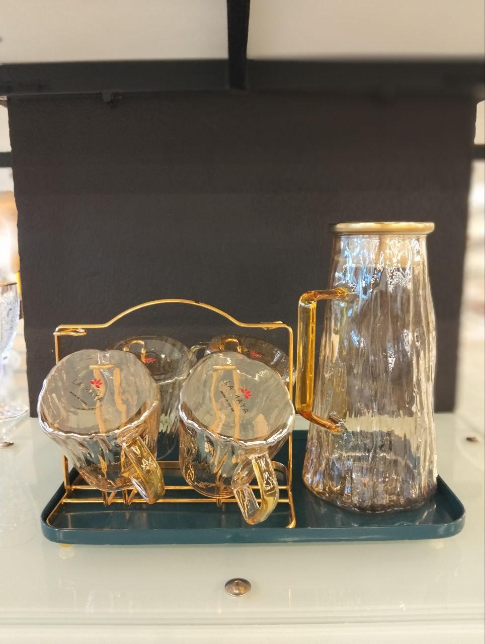 Glass drink set with gold-plated handle and serving tray with distinctive sequoia pattern, code GX-43-T