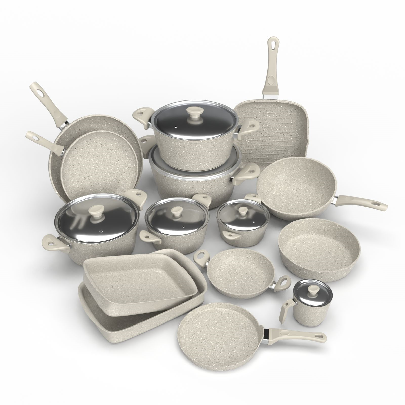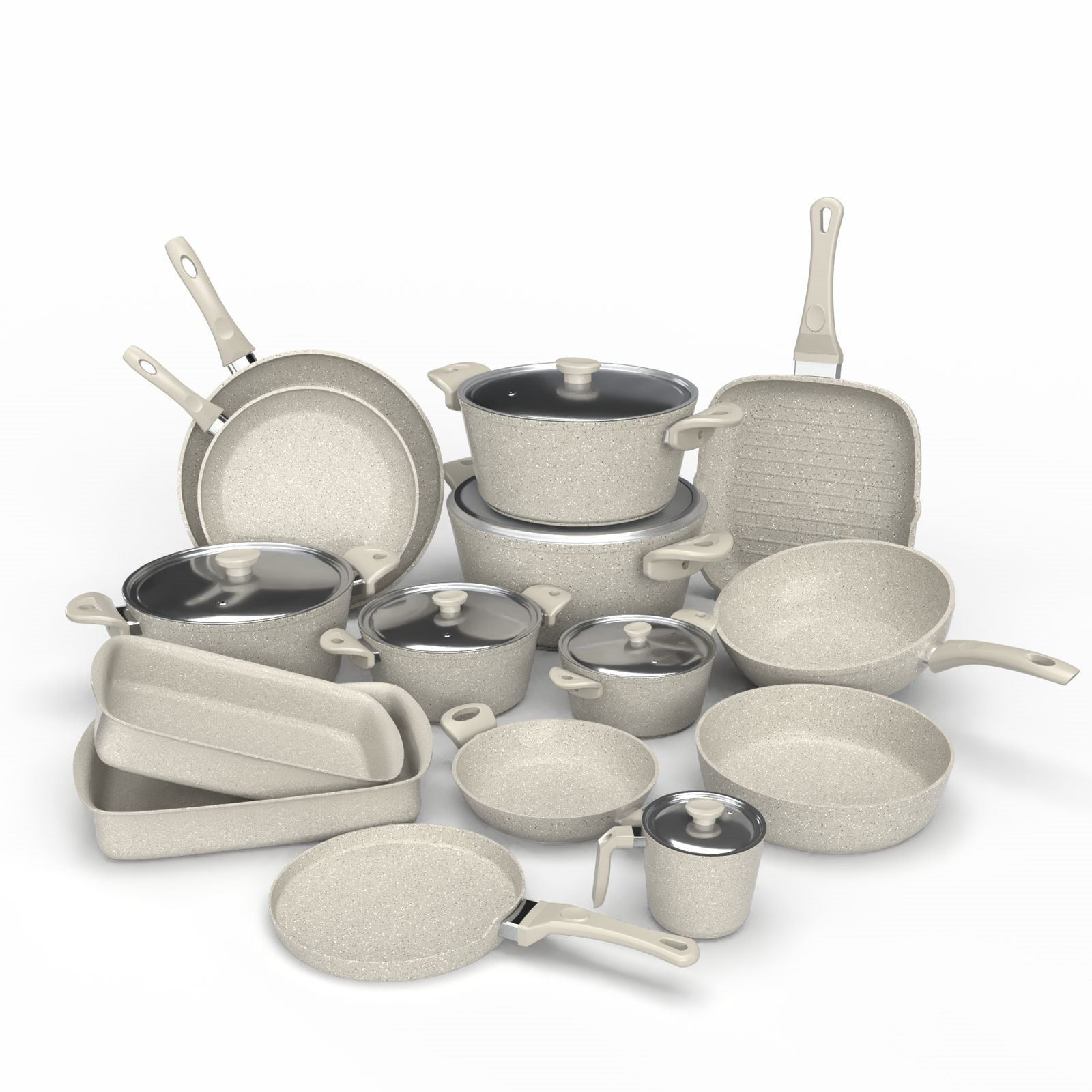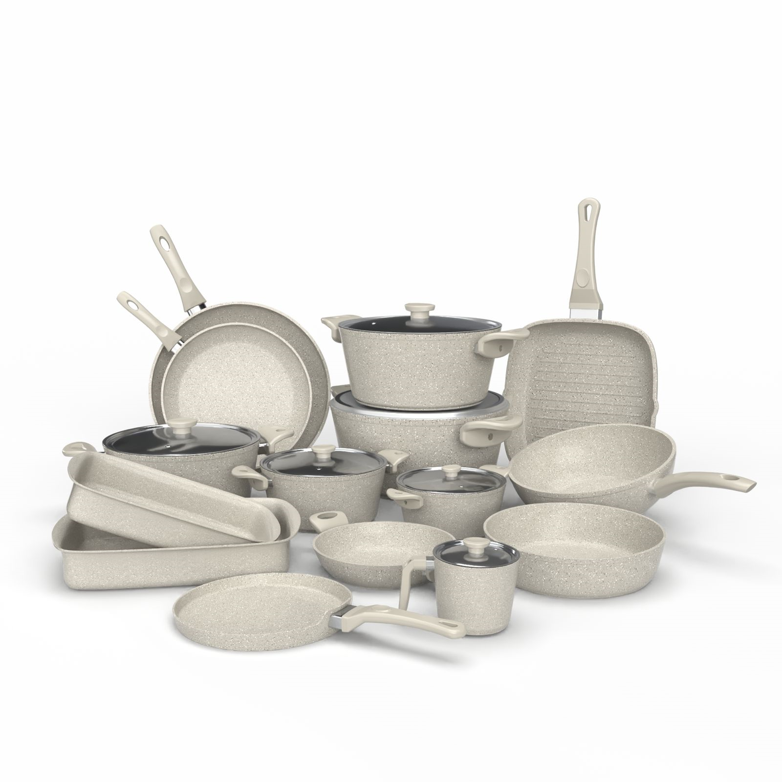 Granite Cookware Set Top Chef 21 Pieces Beige Composition (Pots 18-20-24-26-30 / Frying Pans 24-30 / Wok 28 / Grill Pan 28 / Milk Pan 16 / Deep Frying Pan 30 / Crepe Pan 28 / Egg Plate 22 / Casserole