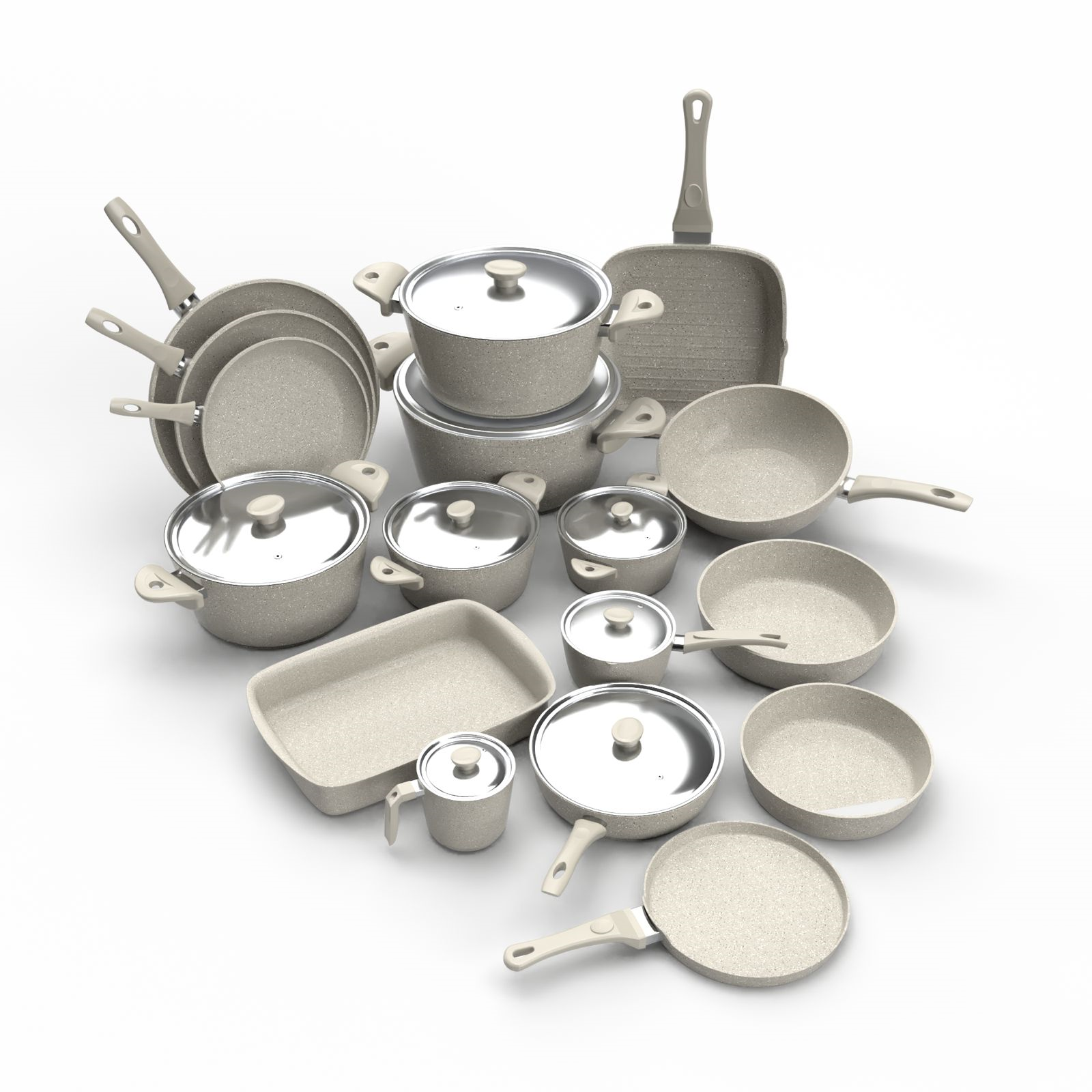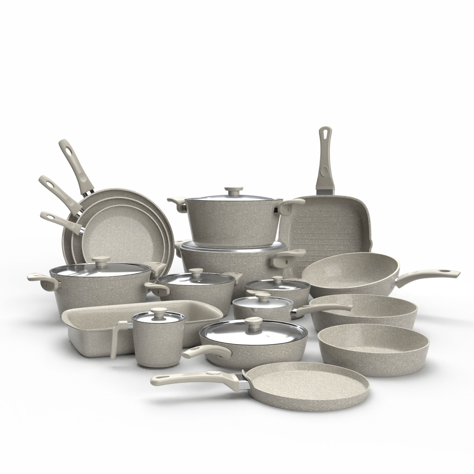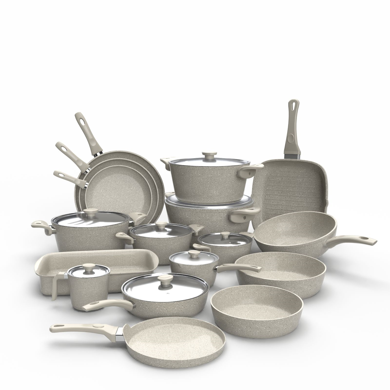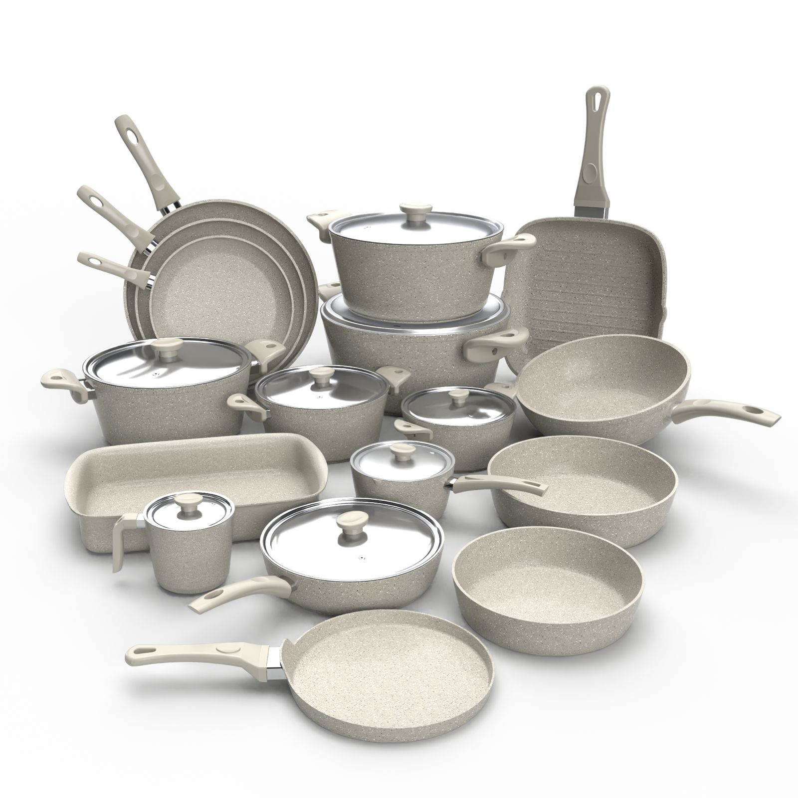 Granite Cookware Set Top Chef 25 Pieces Beige Composition (Pots 16-20-24-26-30 / Frying Pans 20-24-30 / Milk Pan 16 / Grill Pan 28 / Wok 28 / Deep Frying Pans 26-30 / Casserole 30 / Sauté Pan 26 / Sau