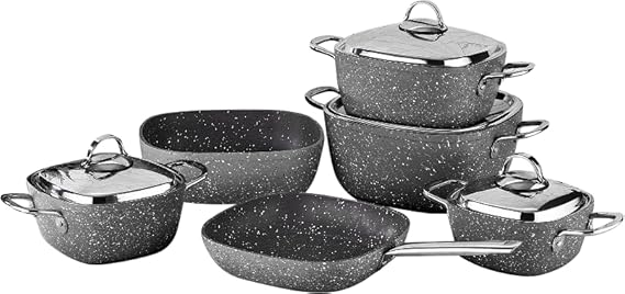 Granite Power Line 10-piece square set includes pots (18-20-24-28 cm) a 26 cm frying pan and a 28 cm baking tray in gray (66410GR).