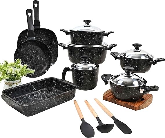 Granite Power Line 13-piece square set includes pots (18-20-24-28 cm) a 24 cm frying pan a 31 cm casserole a 28 cm grill and a 16 cm milk pot with a black steel handle (66603GR).