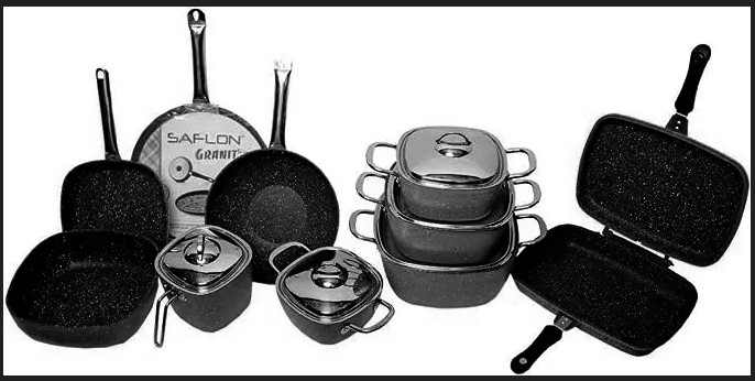 Granite Power Line 15-piece square set includes pots (18-20-24-28 cm) a 24 cm frying pan a 16 cm milk pot a 28 cm wok a 36 cm double grill a 31 cm casserole and a 32 cm crepe pan in black.