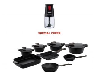 Granite Pyrex Cookware Set – 21 Pieces (Pots: 18, 20, 24, 30 cm) + Frying Pan: 20 cm + Rectangular Tagine: 31 cm + Grill Pan: 28 cm + Wok: 28 cm + 4 Silicone Holders + 5 Black Artisan Distributors – I