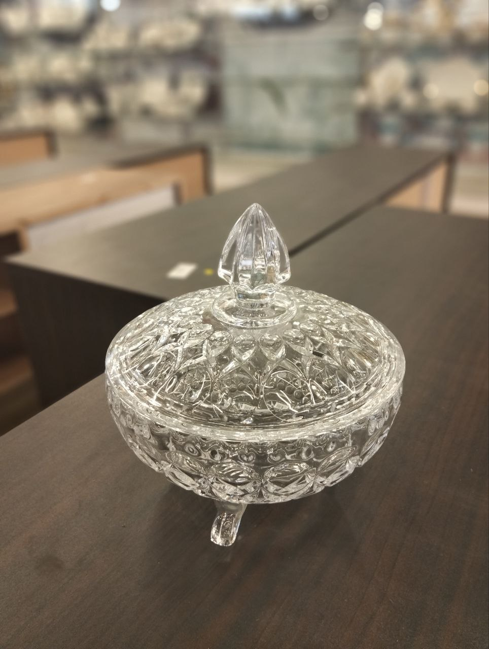 Living Home Crystal Glass Bonbonniere – Luxurious classic design with diamond-like engravings, elegant legs, and golden interior accents. Perfect for serving candies or as a refined decorative piece.