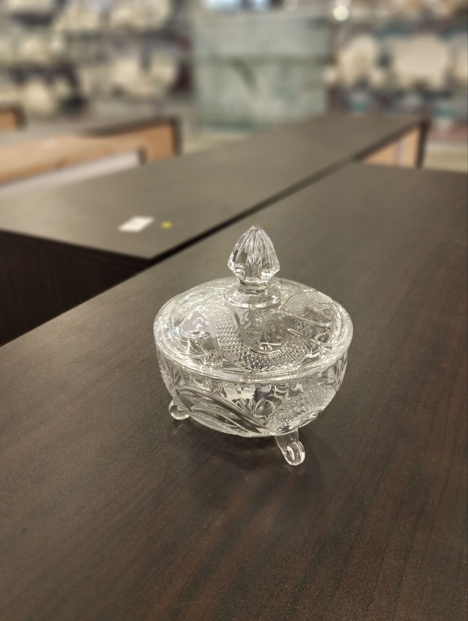 Luxurious glass bonbonniere with three legs and raised leaf engravings with lid featuring faceted handle made of high purity transparent glass perfect for sweets or elegant classic decor