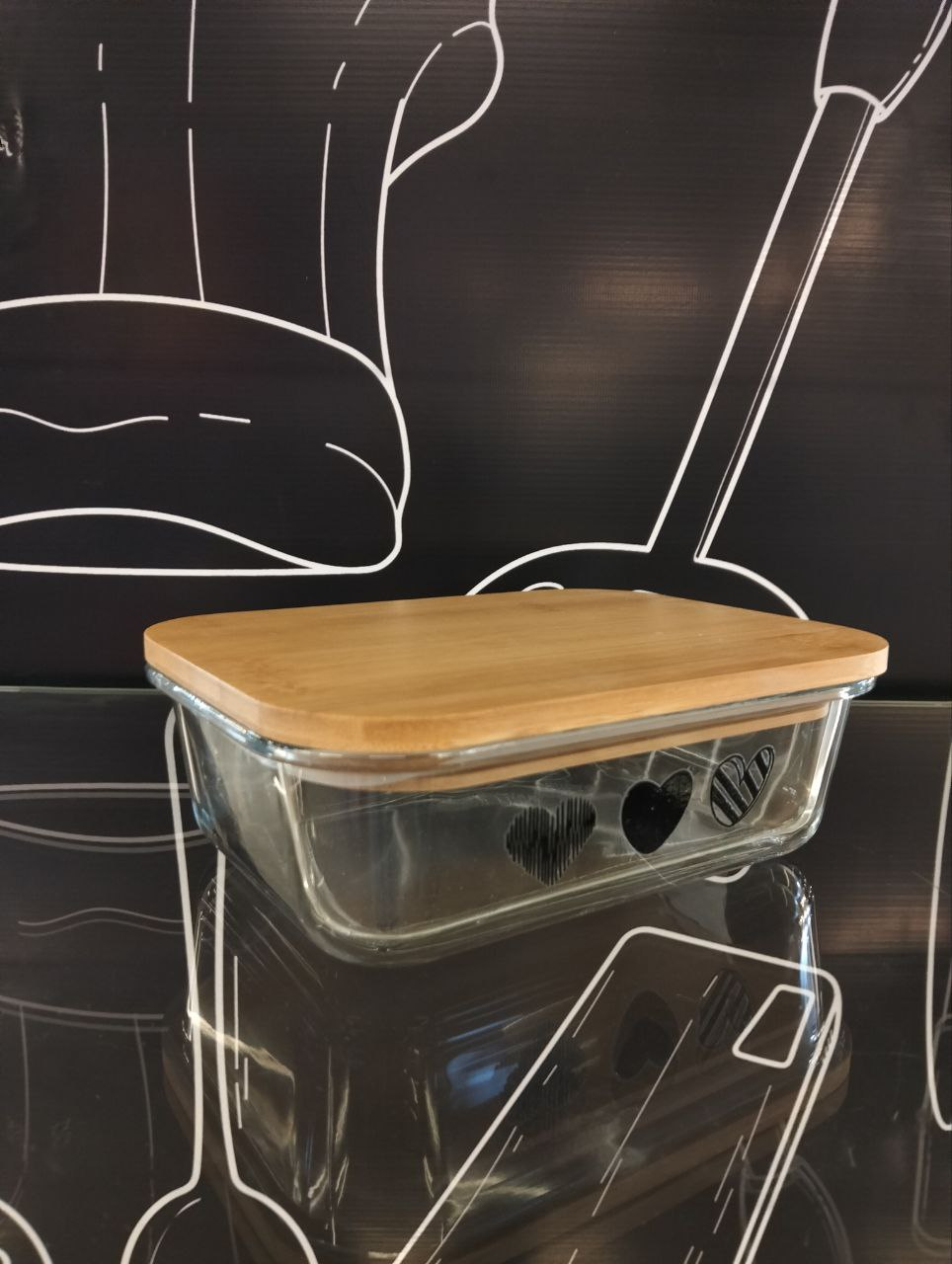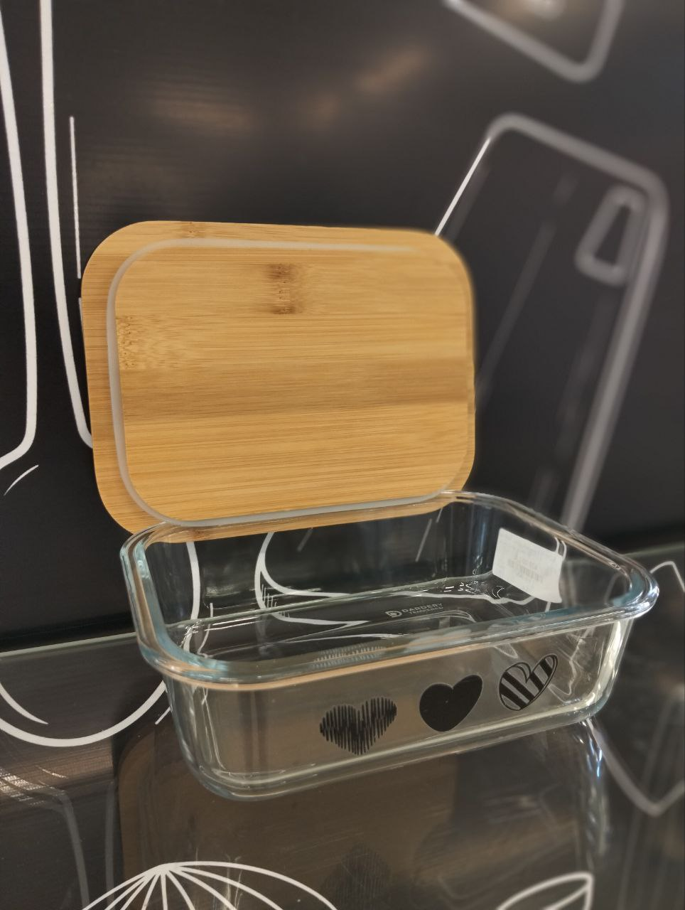 Medium to large rectangular glass refrigerator container with heart-decorated lid