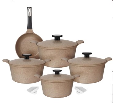 Neoflam Granite Pot Set, Beige, 11-Piece Round, Pots (18-20-24-28 cm) + Fry Pan 24 + 2 Silicone Holders