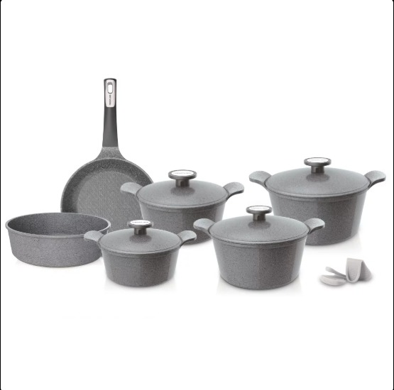 Neoflam Granite Pot Set, Gray, 10-Piece Grooved, Pots (20-22-24-28 cm) + Fry Pan 24 + Casserole 28