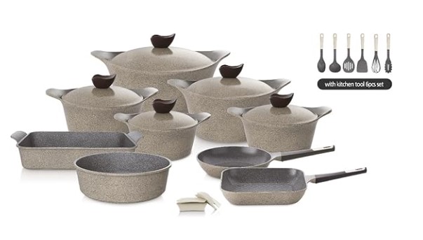 Neoflam Granite Pot Set, Gray, 20-Piece Round, Pots (18-20-22-24-28 cm) + Fry Pan 22 + Grill 28 + Baking Tray 28 + Casserole 28 + 6-Piece Utensil Set