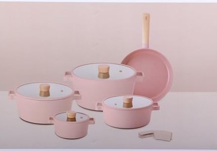 Neoflam Granite Pot Set, Pink, 11-Piece Fika, Pots (16-22-24-26 cm) + Fry Pan 24 + 2 Silicone Holders