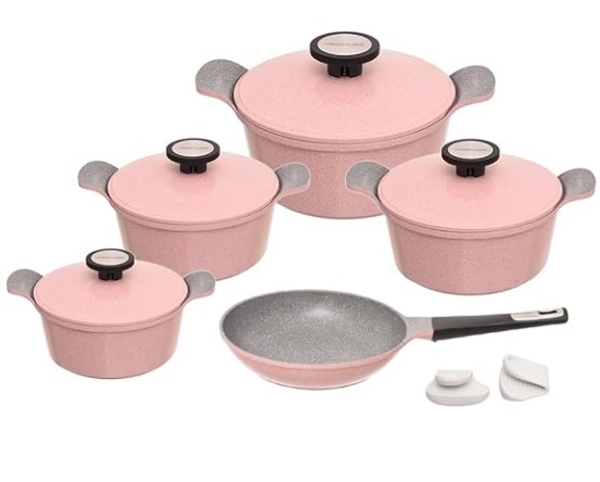 Neoflam Granite Pot Set, Pink, 11-Piece Special Edition, Pots (20-22-24-26-28 cm) + Fry Pan 26 + 2 Silicone Holders