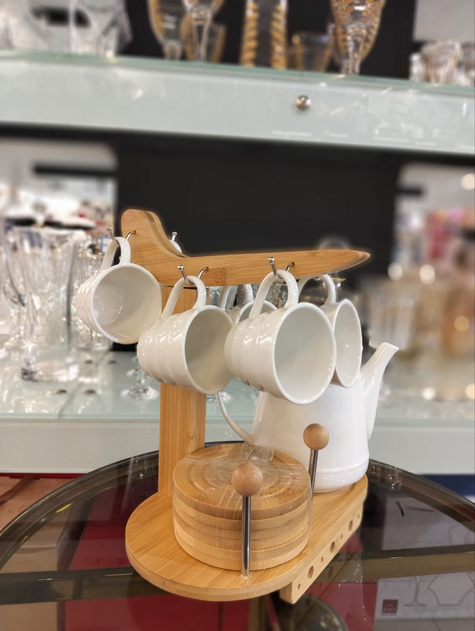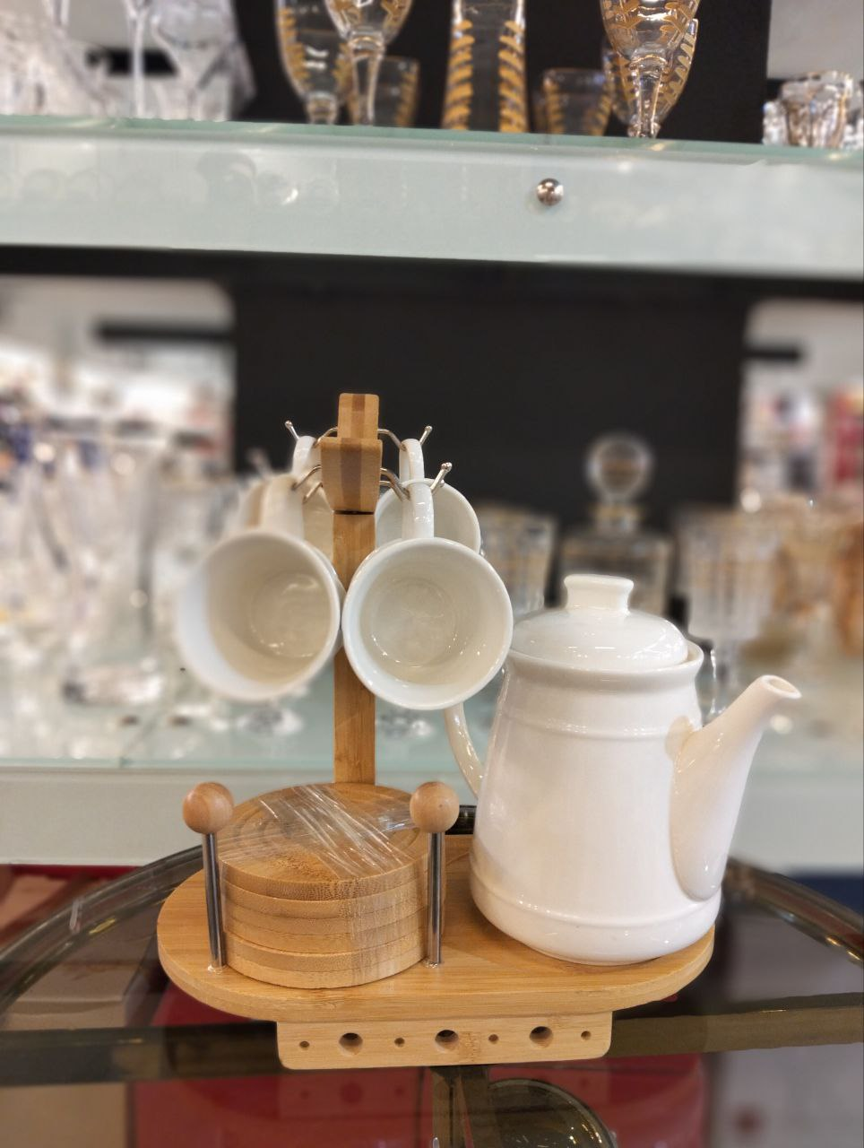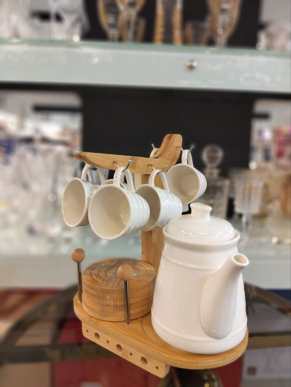 Porcelain tea set consisting of teapot plus 6 white ceramic cups with 6 wooden coasters and versatile wooden holder