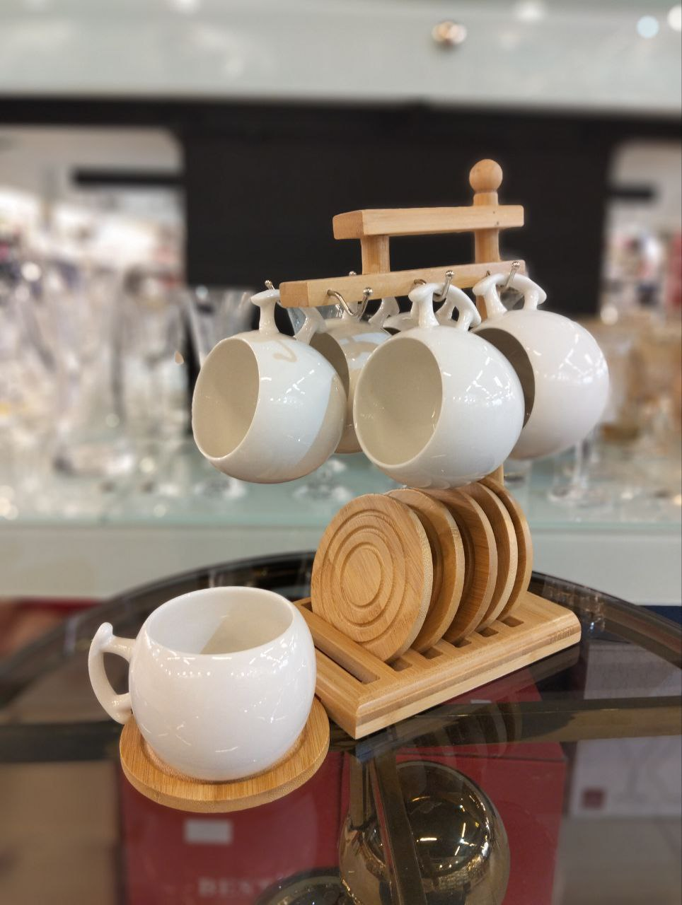 Set of 6 porcelain mugs with 6 wooden serving coasters and wooden holder for organization and display