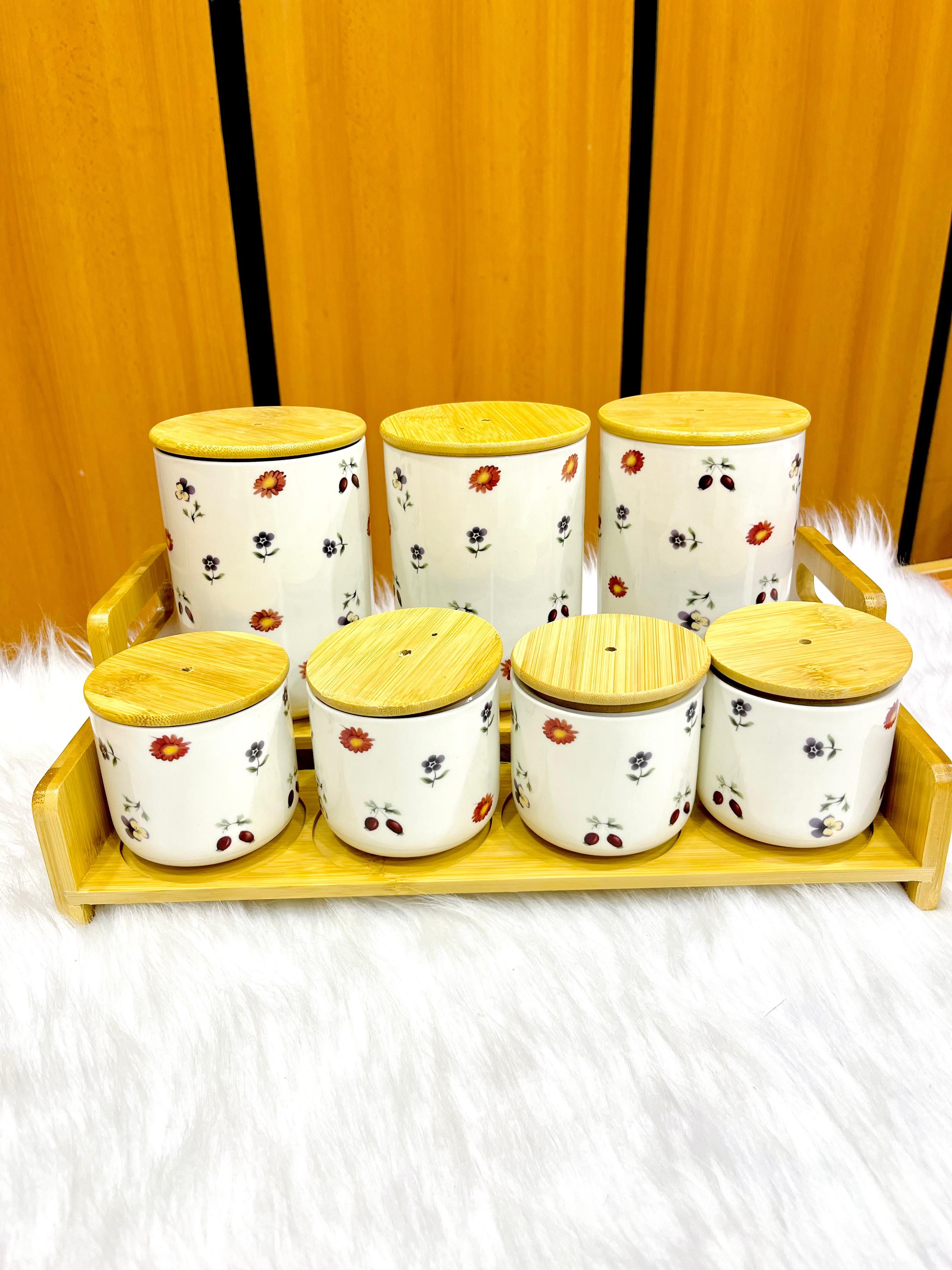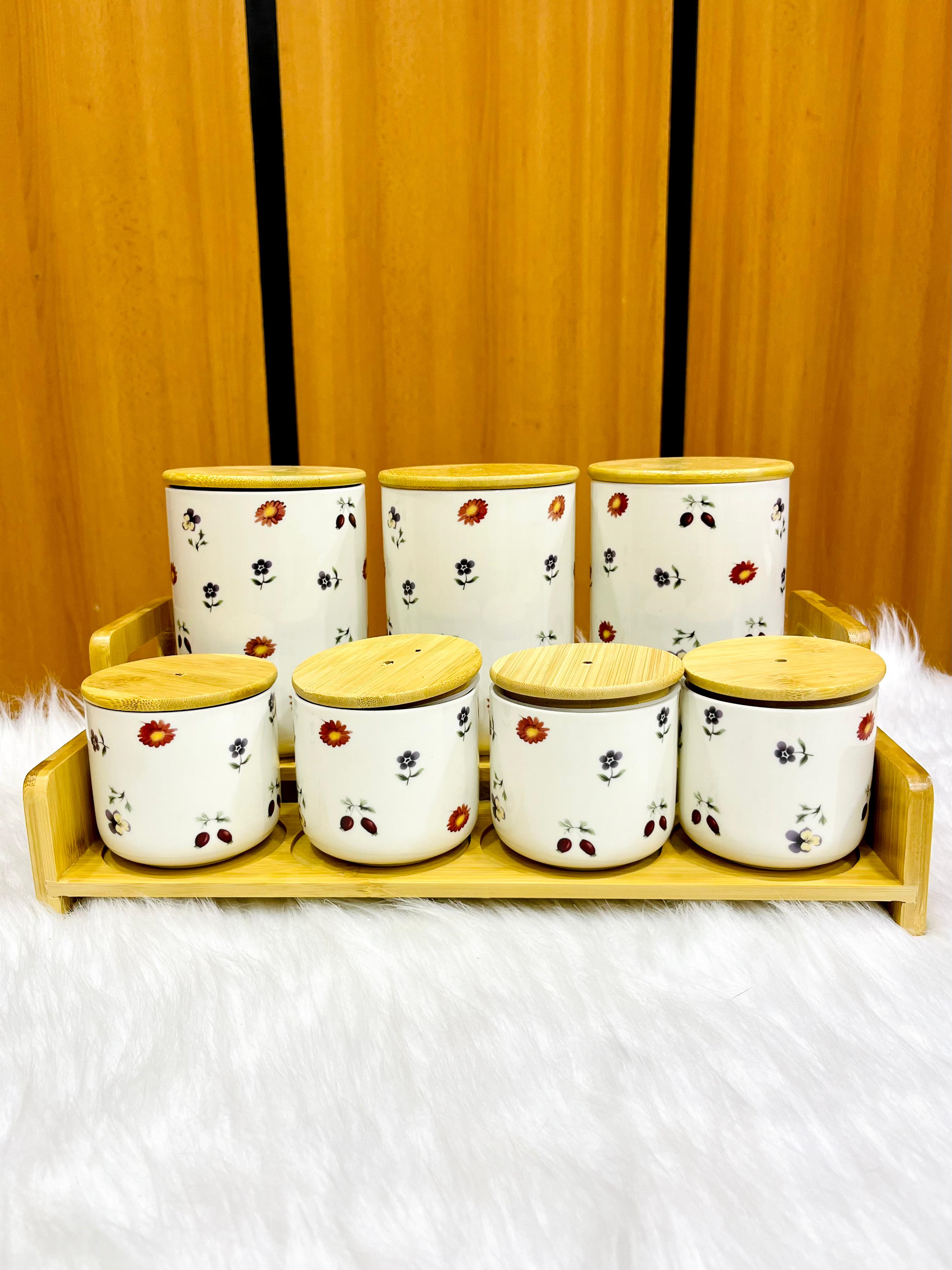 Set of 7-piece creamy porcelain spice jars with natural light wooden lids with conical handles including 3 tall and 4 short jars placed inside a matching wooden tray ideal for kitchen organization