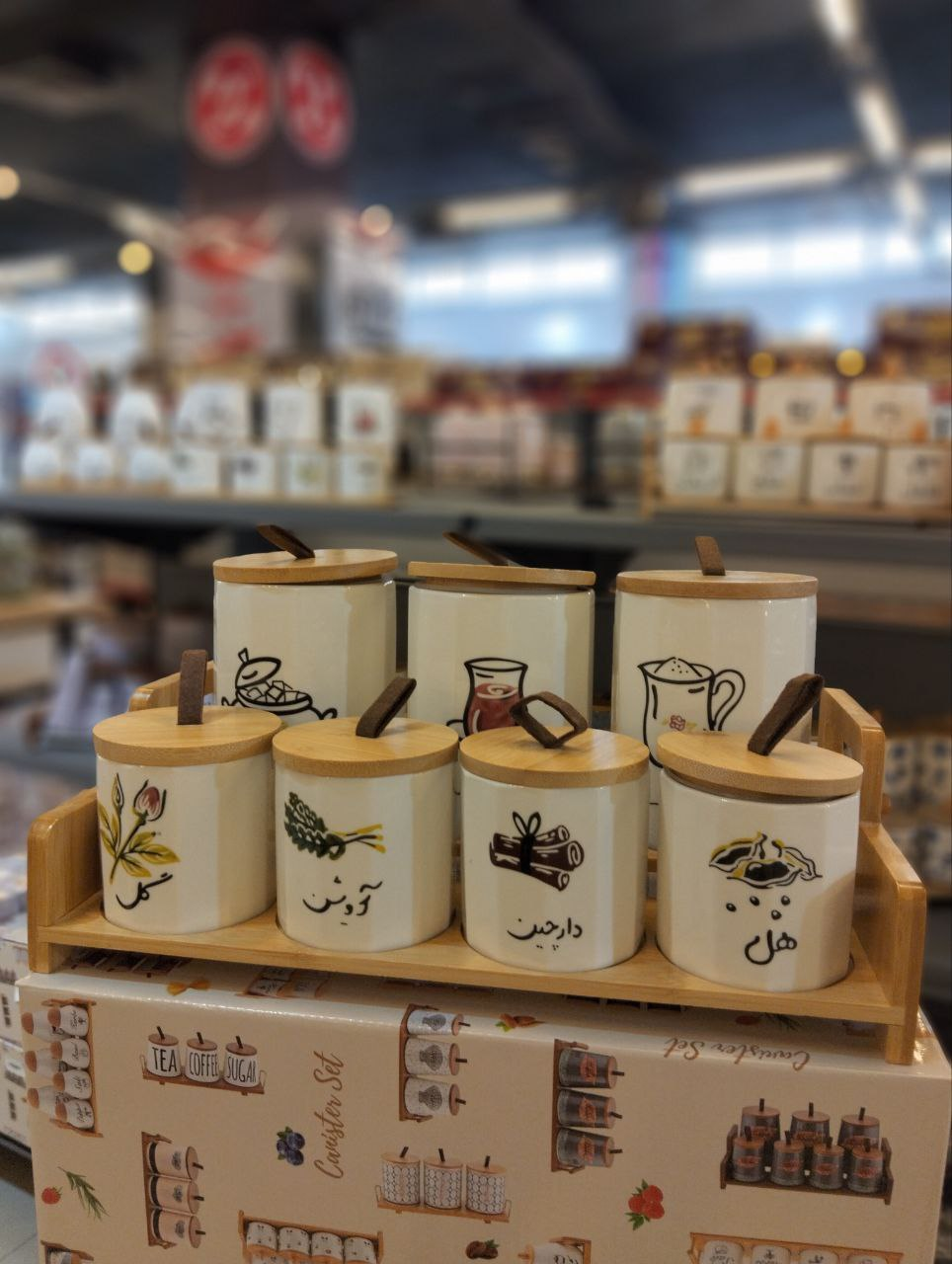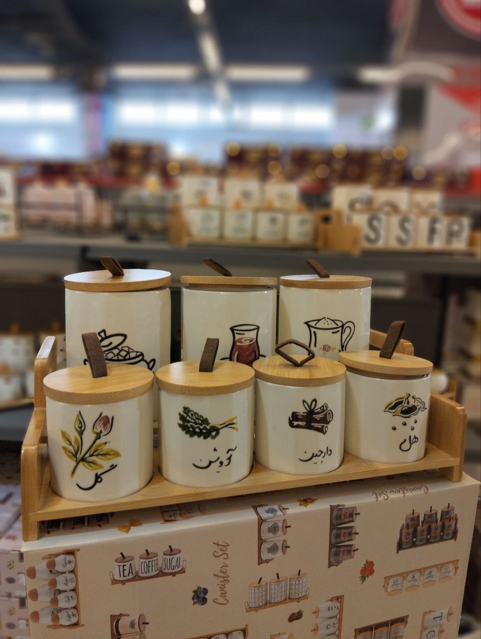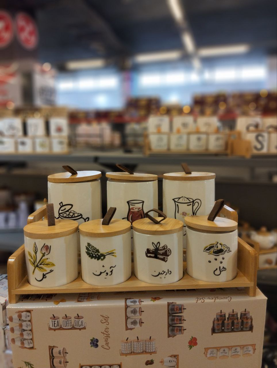 Set of 7-piece porcelain spice jars in different sizes equipped with tight wooden lids and elegant wooden display base