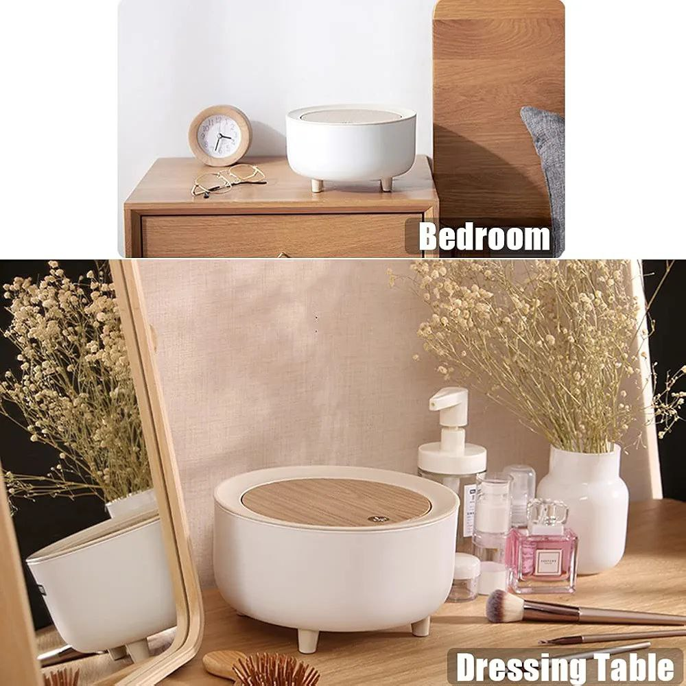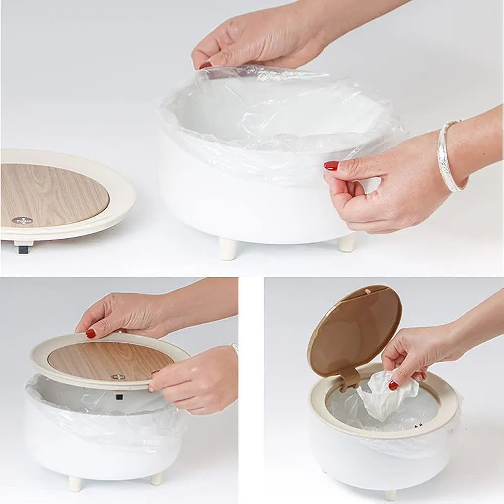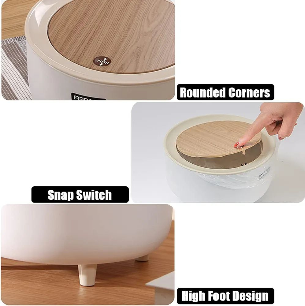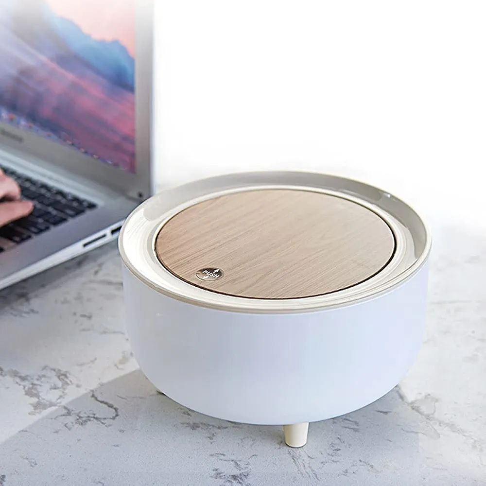 Small modern trash bin with simple half-spherical pot-like design made of white plastic with light wooden lid opening easily with push button and barely visible small legs