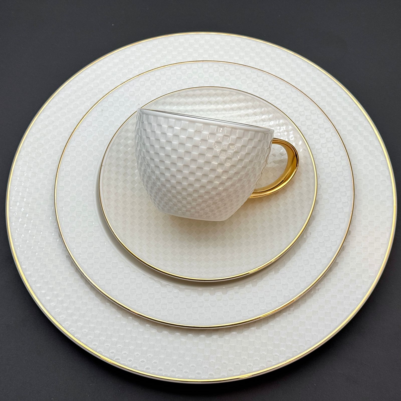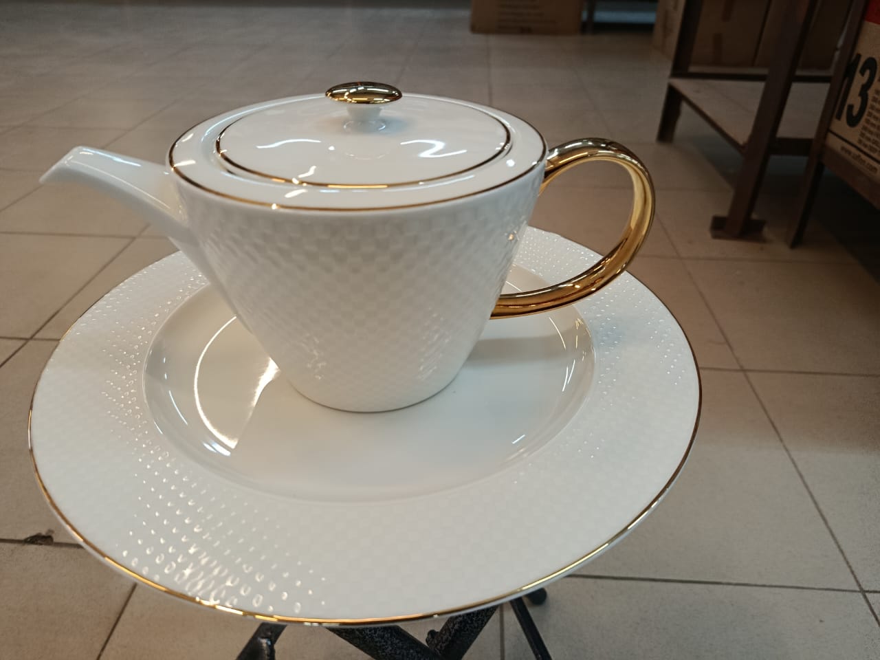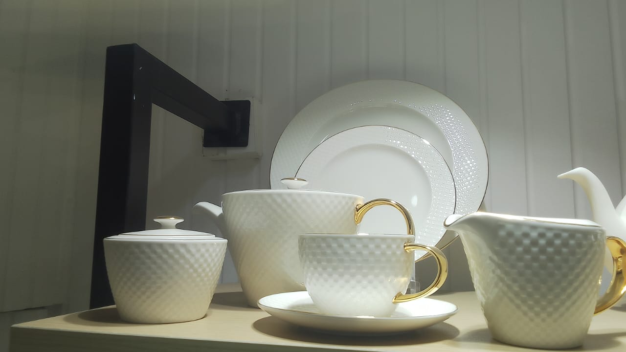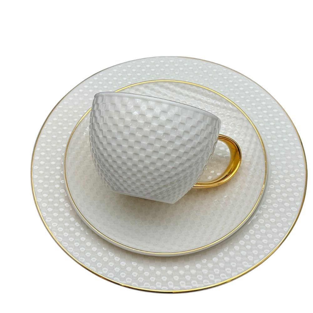 Tea and cake set, 24 pieces, Thai made, Elegant brand, pure white with embossed elegant net pattern and golden touches on handles and lids.