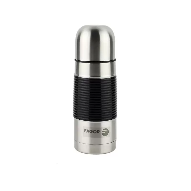fagor Thermal Mug 350 ml - Made of stainless steel with double insulated walls to keep liquids hot for a long time, lid with dosing button to prevent spills, comfortable non-slip rubber grip, Spanish