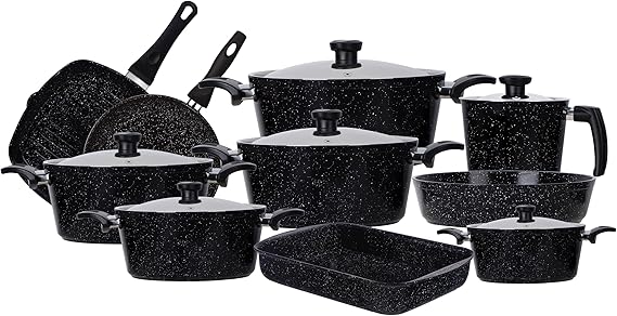 Granite cookware set Top Chef 16 pieces round formation (18+20+22+24+28) + 30 cm tray + 28 cm grill + 16 cm lid + 26 cm frying pan black