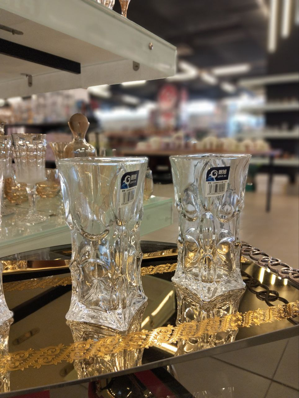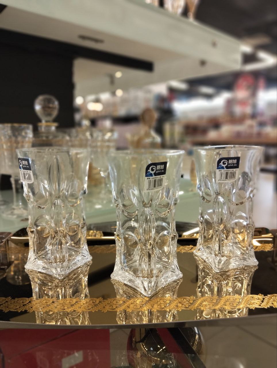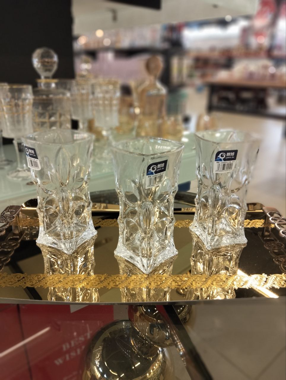 Living Home glass mug, set of 6 pieces, transparent with a unique square design, heavy base, and geometric decorations