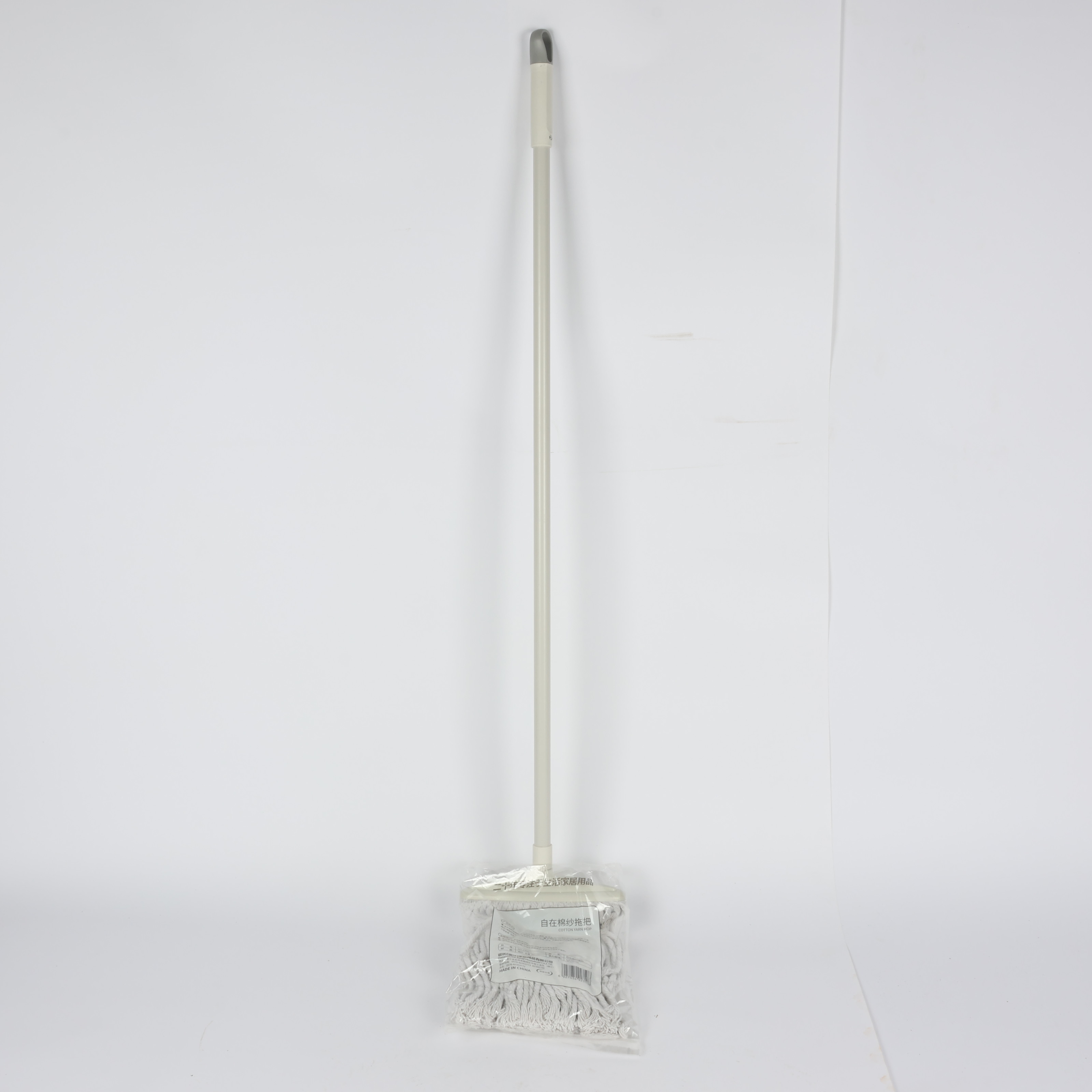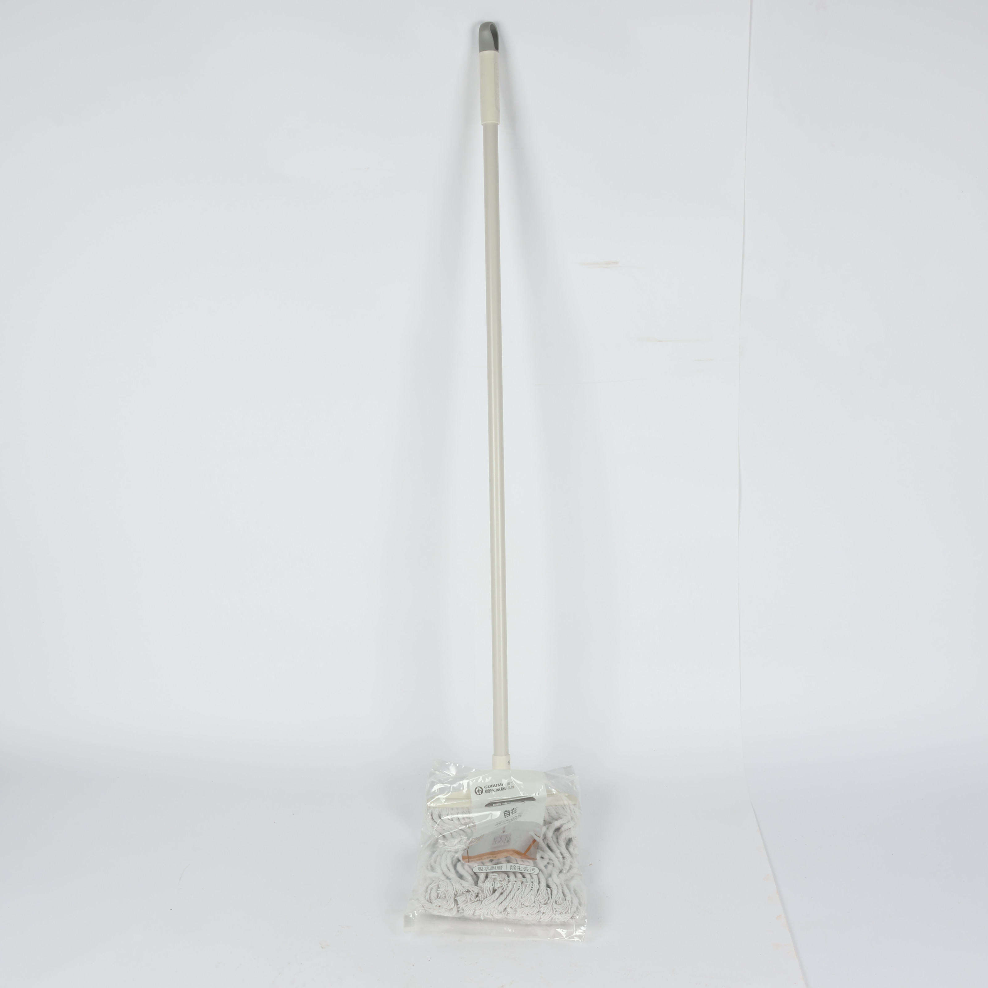 Mop with dense cotton bristles and long wooden handle, beige and white