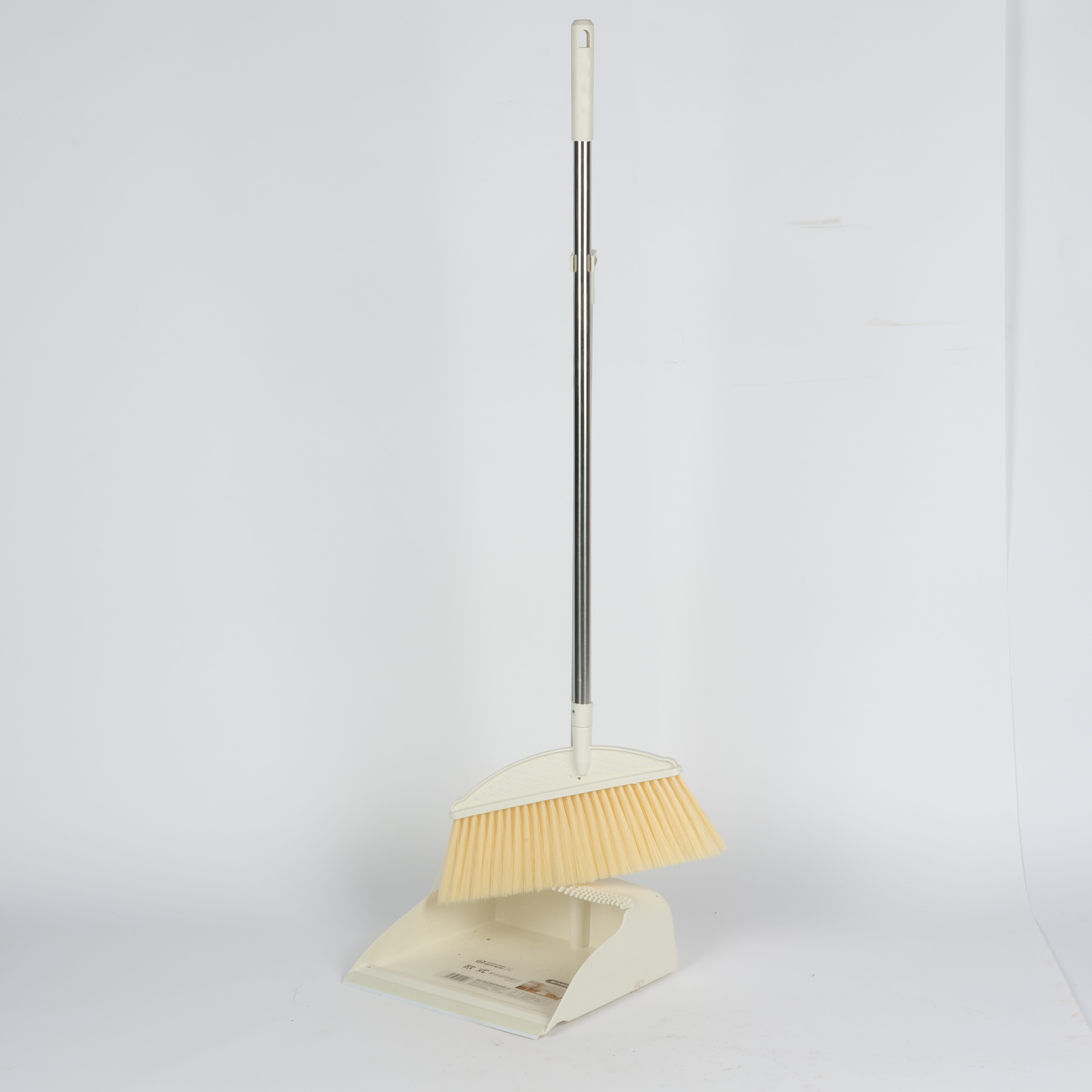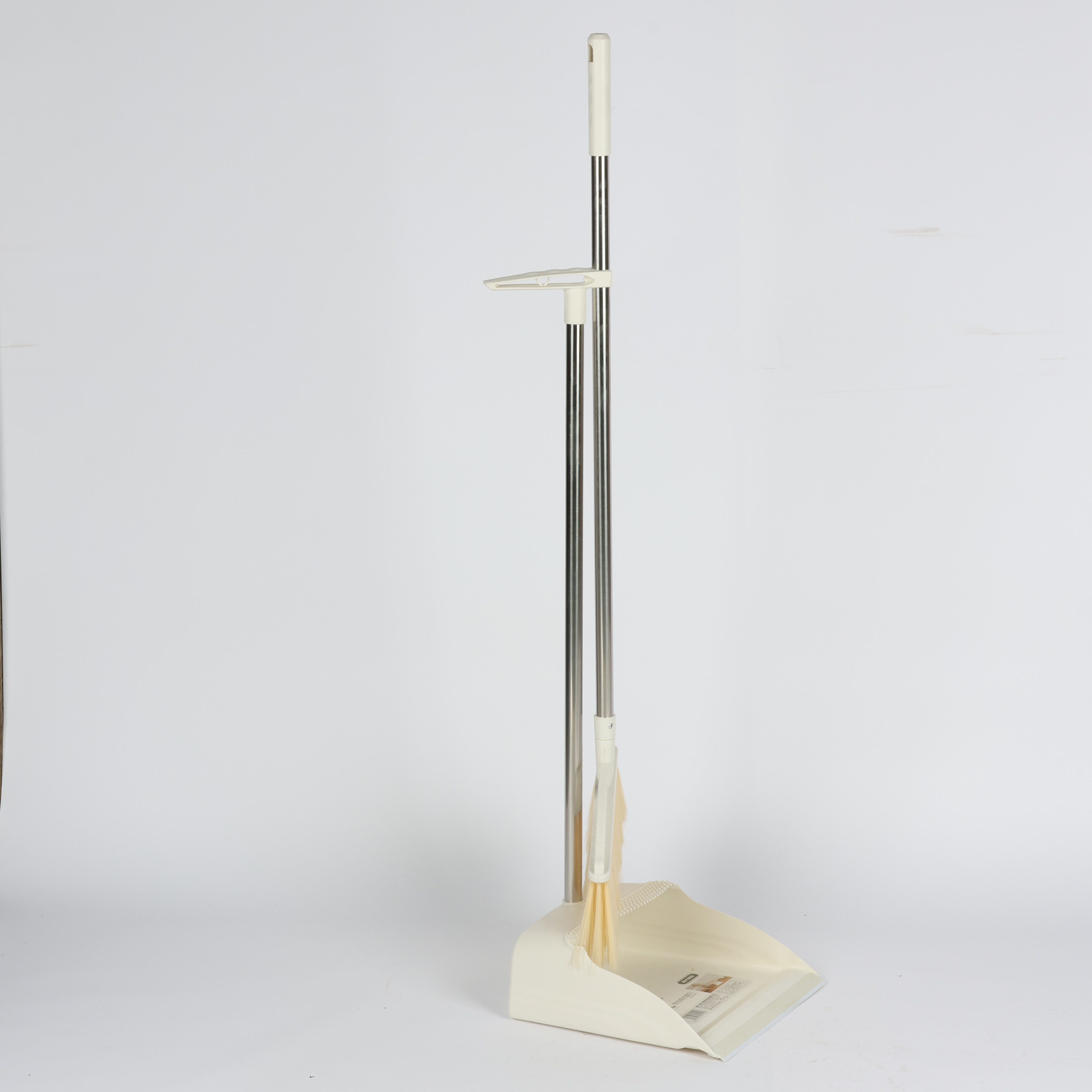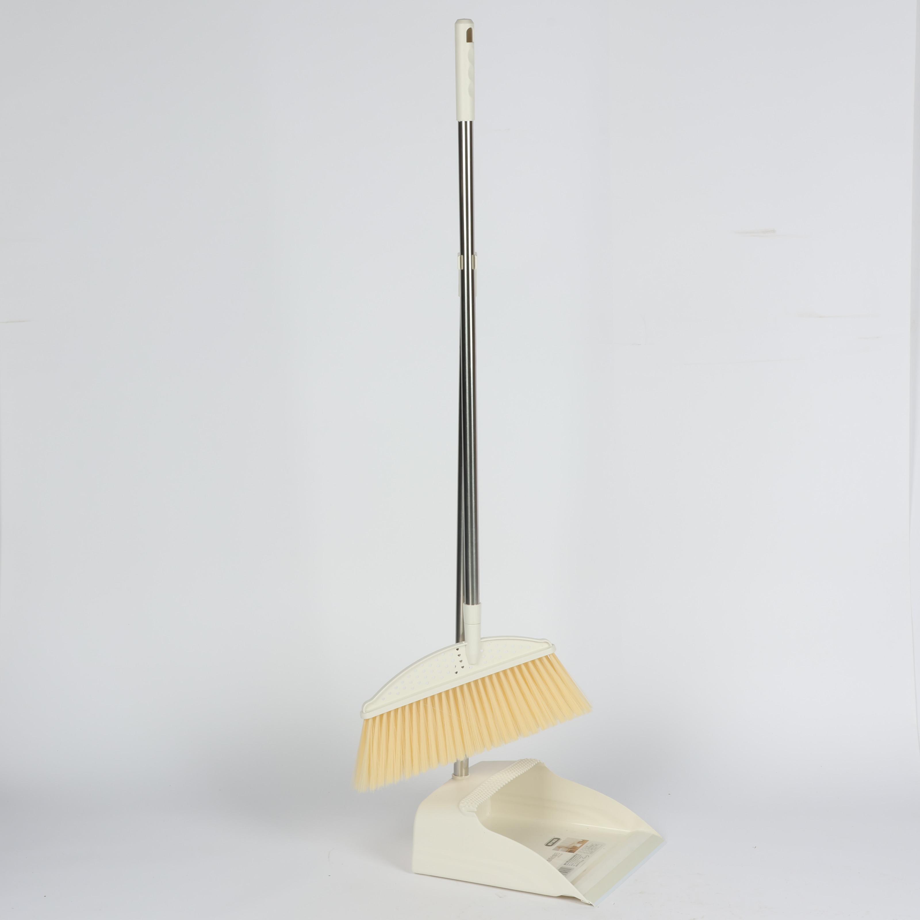 broom and dustpan set with long metal handle and soft bristles Beige