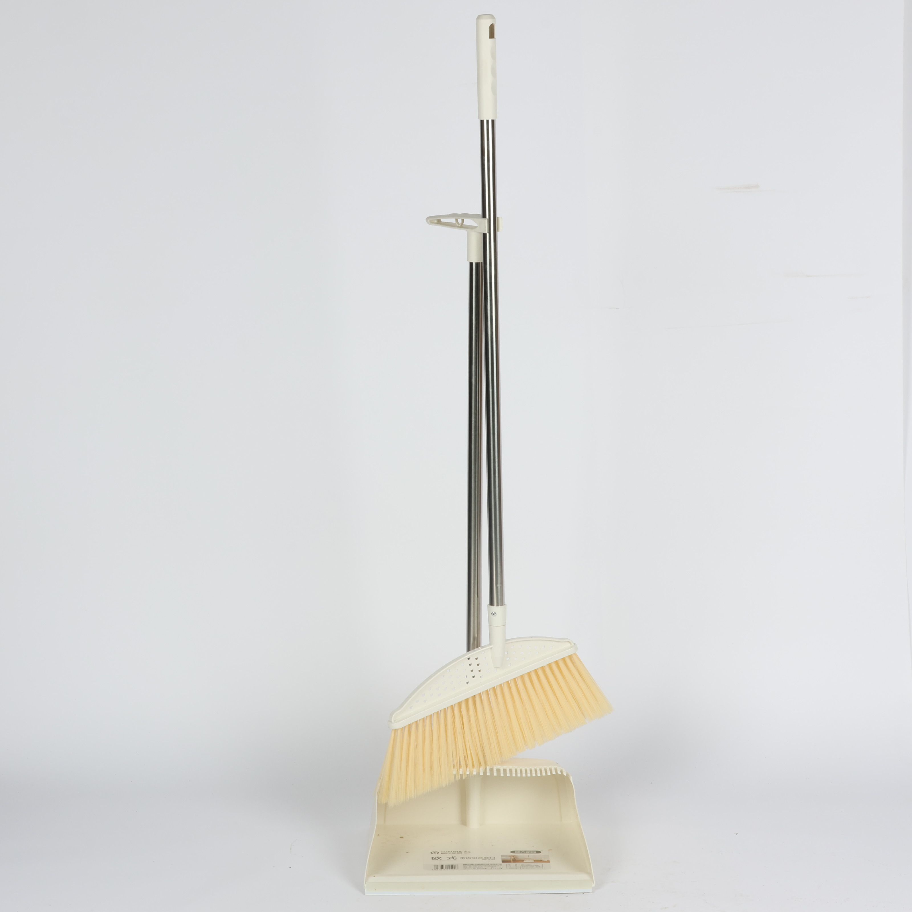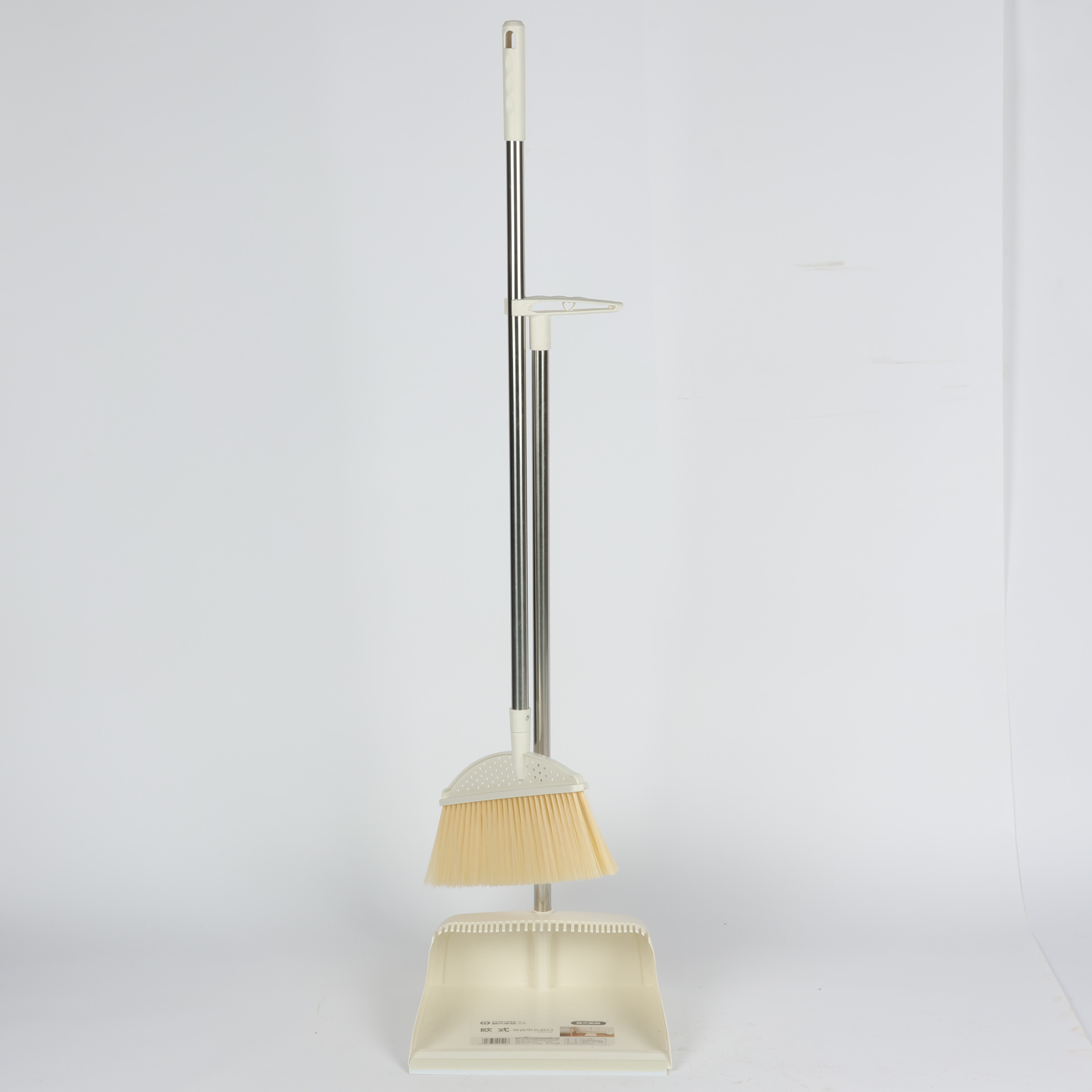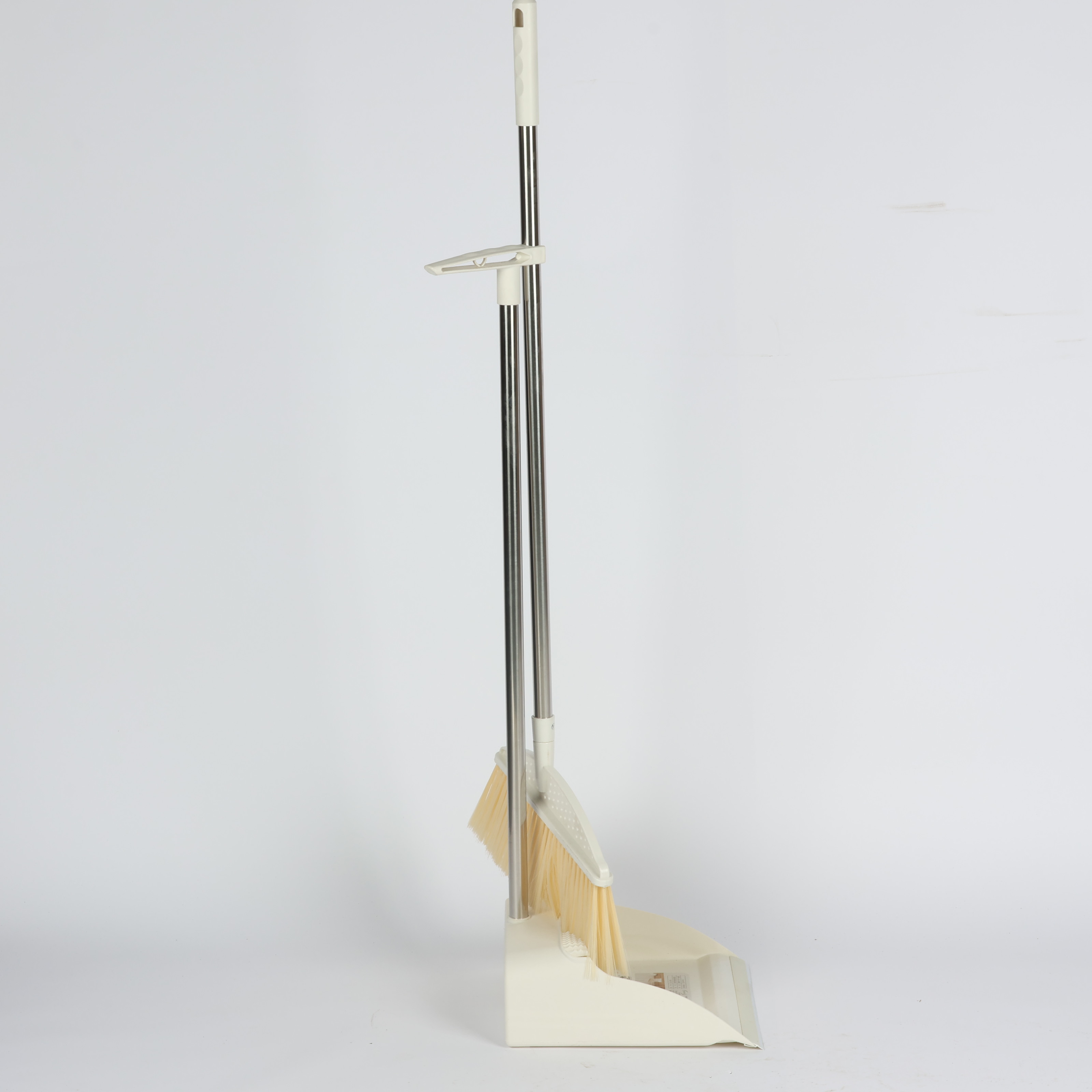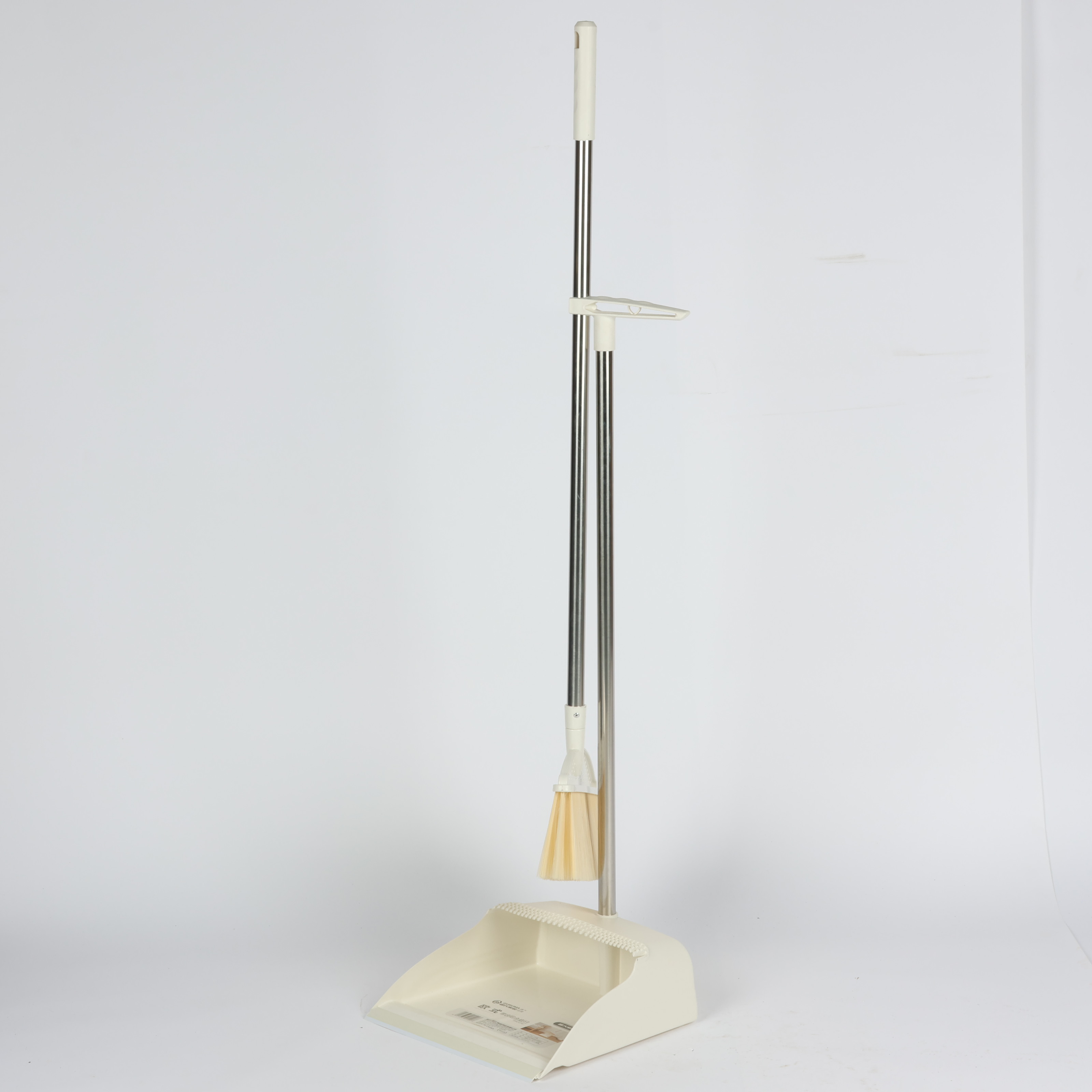 broom and dustpan set with long metal handle and soft bristles Beige