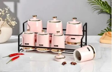 Porcelain Spice Set 8 Pieces, 4 Medium Jars and 3 Large Jars with Two-Tier Holder Pink and Gold Color, Code jjD-749-4