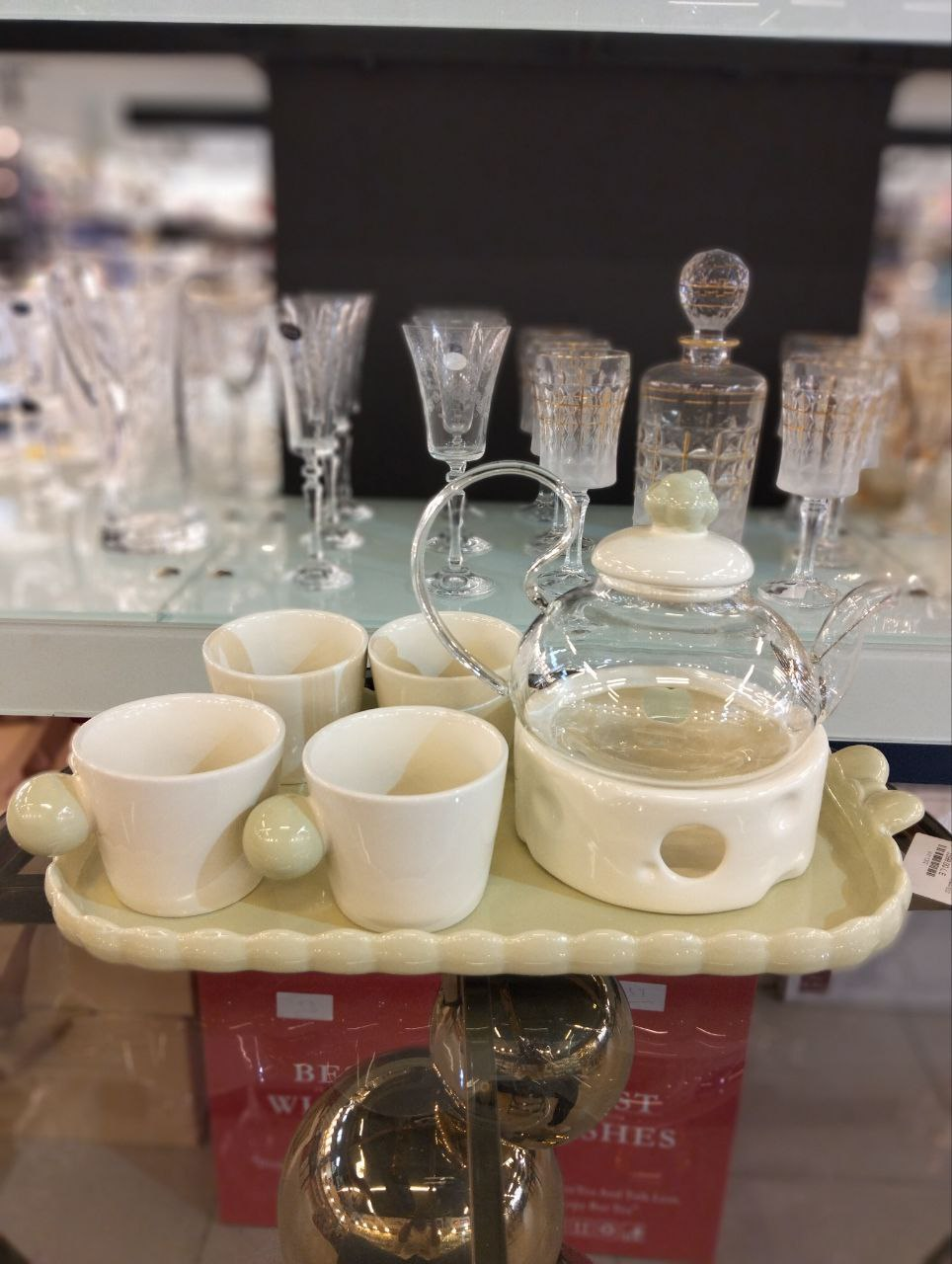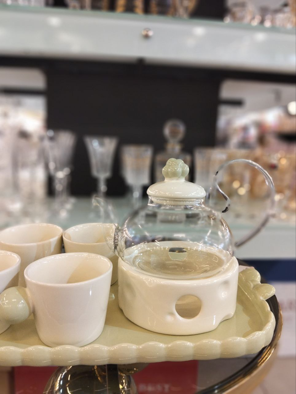 A tea set consisting of a transparent glass teapot, four cream-colored porcelain cups with green spherical handles, and a rectangular serving tray.