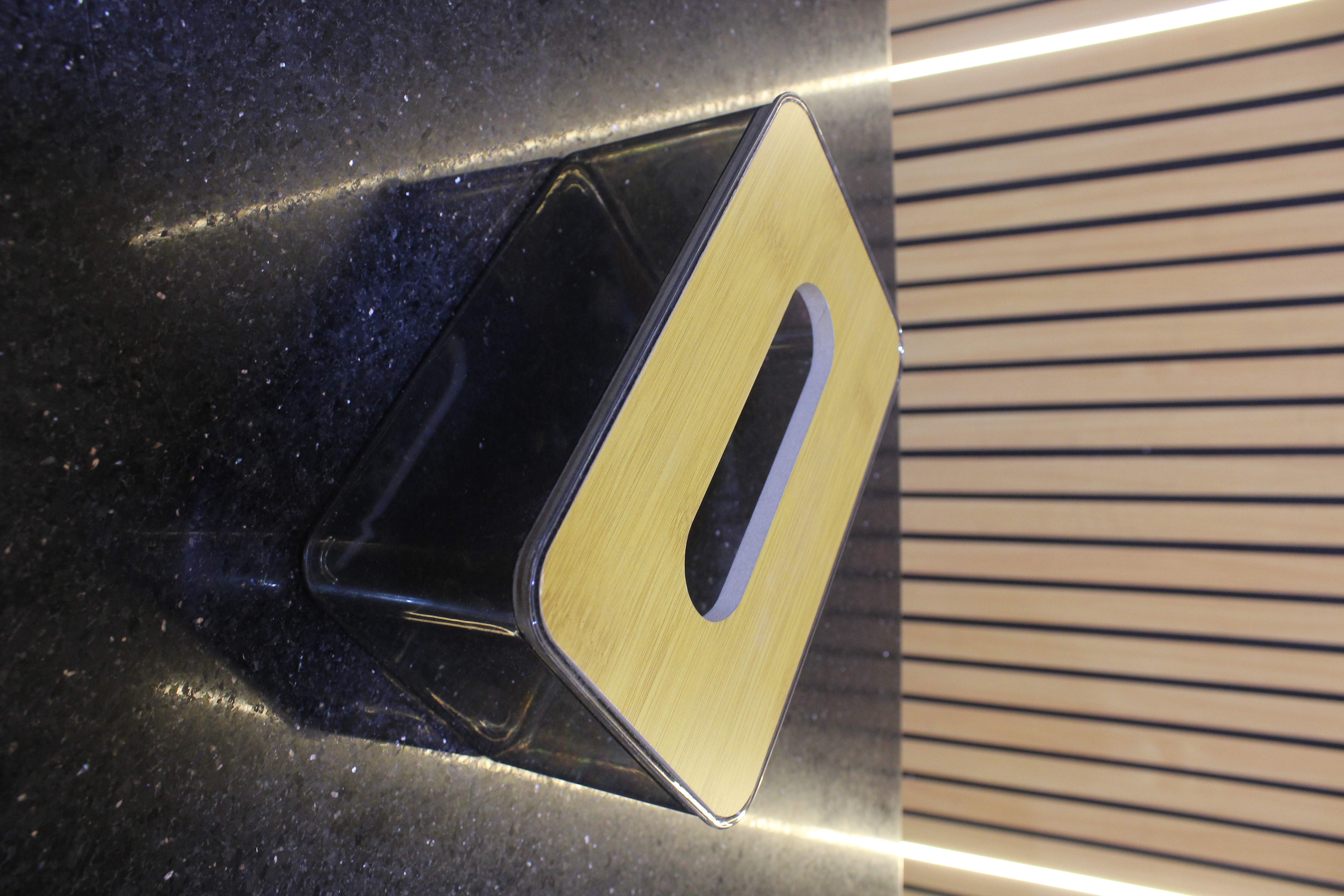 Turkish acrylic tissue box with wooden lid.