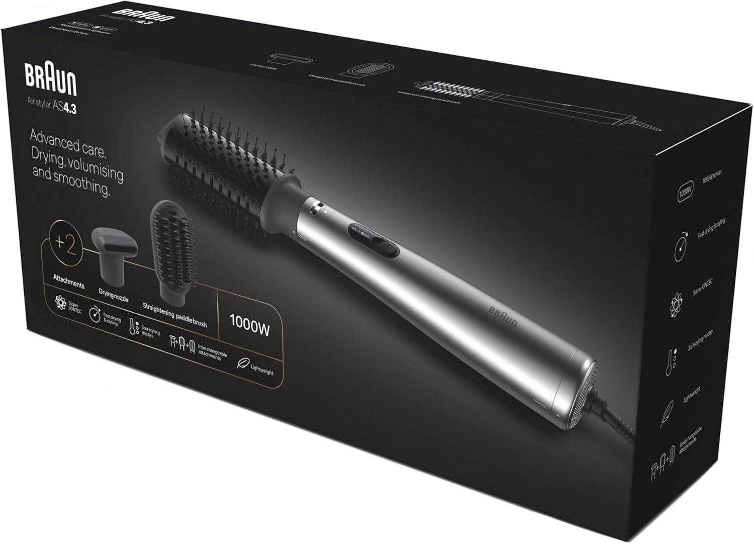 Braun 1000W Hair Brush equipped with three attachments: a concentrator, a round brush, and a straightening brush. Features ionic technology and three adjustable airflow settings.