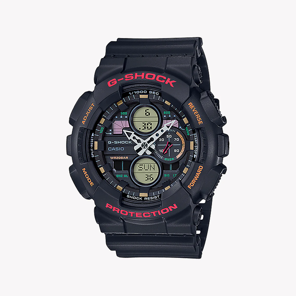 Regular timekeeping: Analog: 2 hands (hour, minute (hand moves every 20 seconds)), 1 dial (speed) Digital: Hour, minute, second, pm, month, date, day