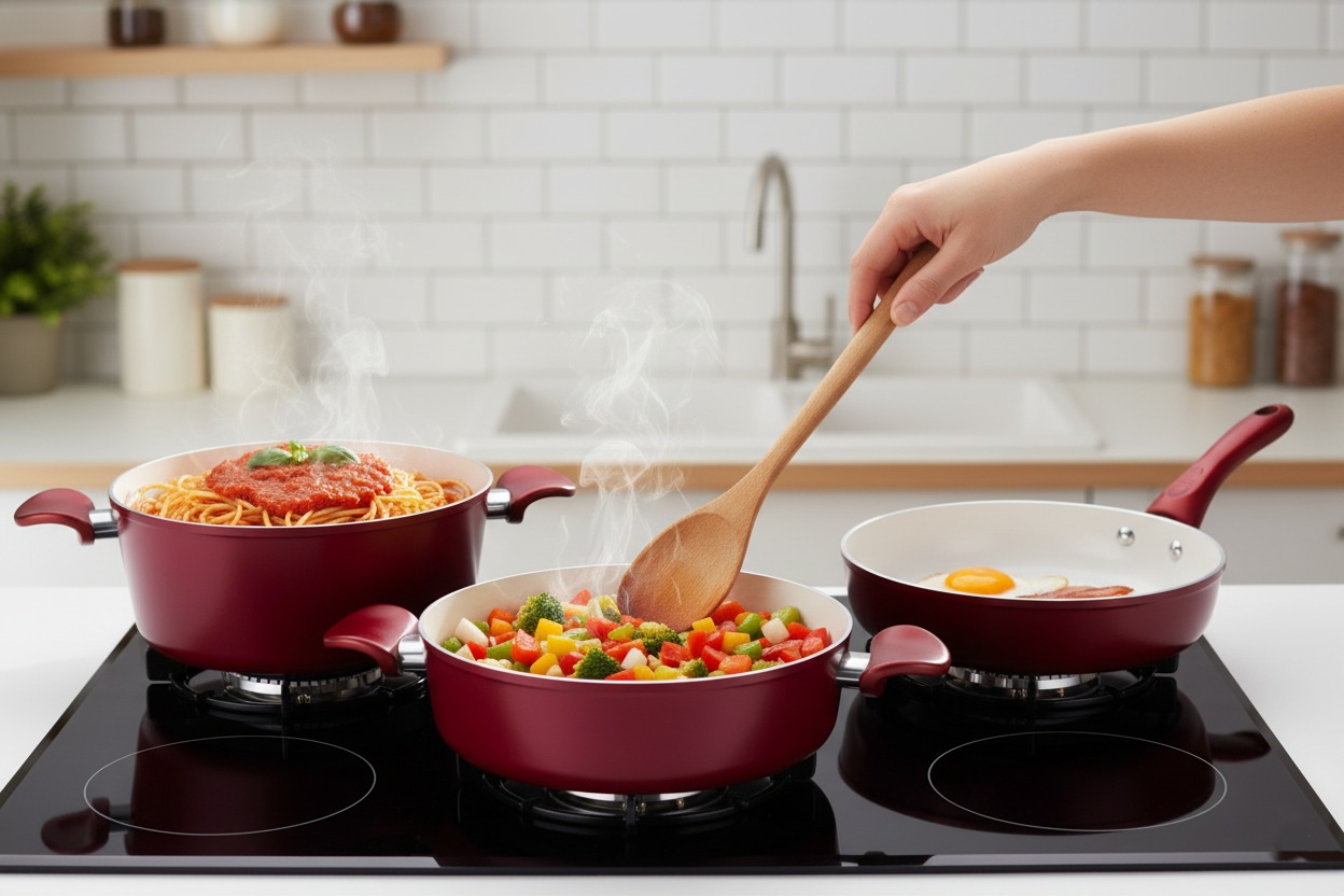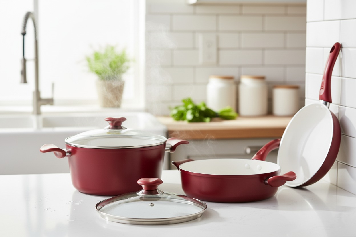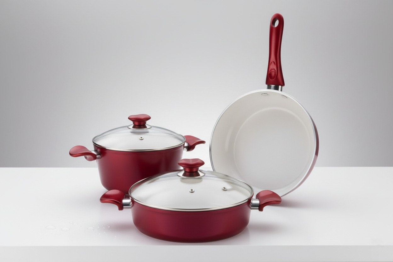 Ceramic Cookware Set 5-Piece– CULINA (GREBLON), two colors (Red, Baby Blue), includes: 22 cm pot, 26 cm pot, 26 cm frying pan, Pyrex lid, Made in Turkey