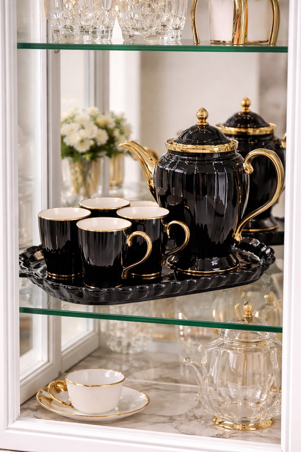 Classic luxury tea set, consisting of one teapot, six cups, and one tray.