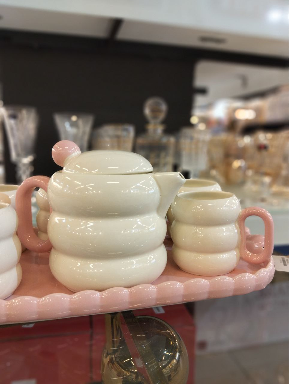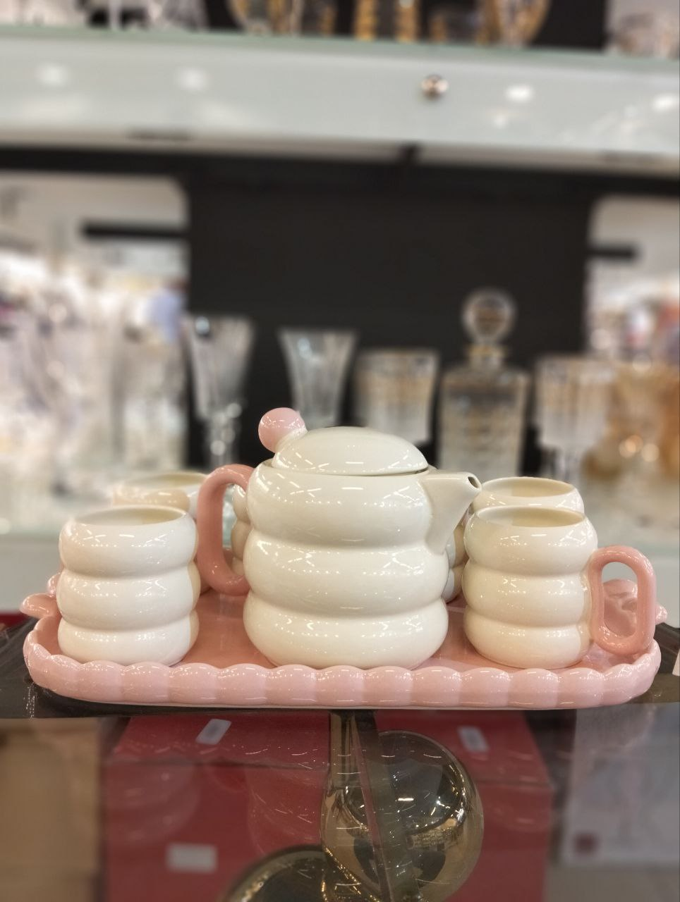 Complete luxury porcelain tea set, modern and elegant, consisting of one teapot, six cups, and one serving tray with creative handles