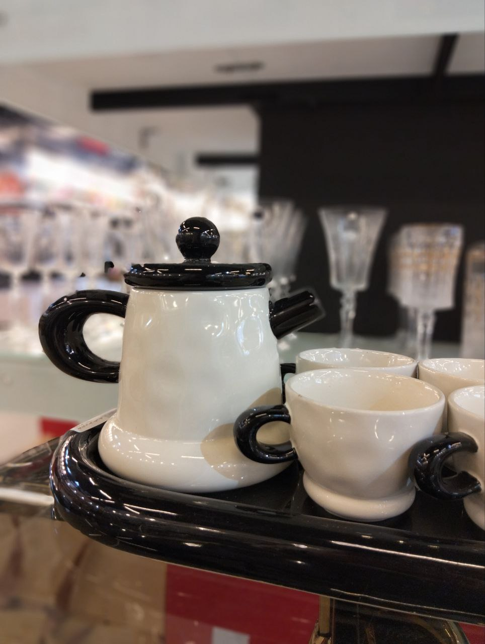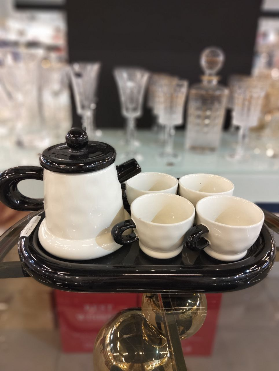 Full porcelain tea set, consisting of one teapot, four cups, and one tray