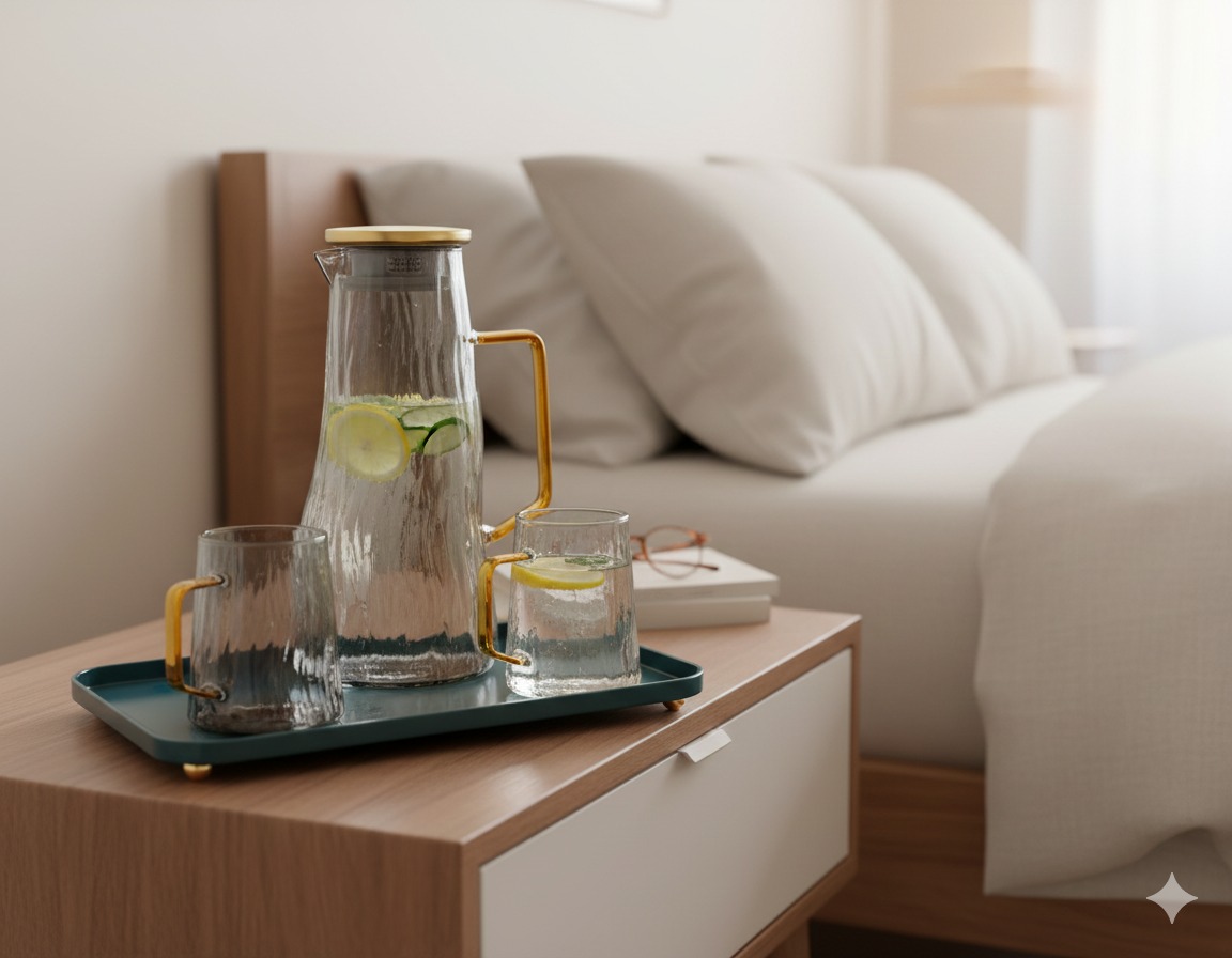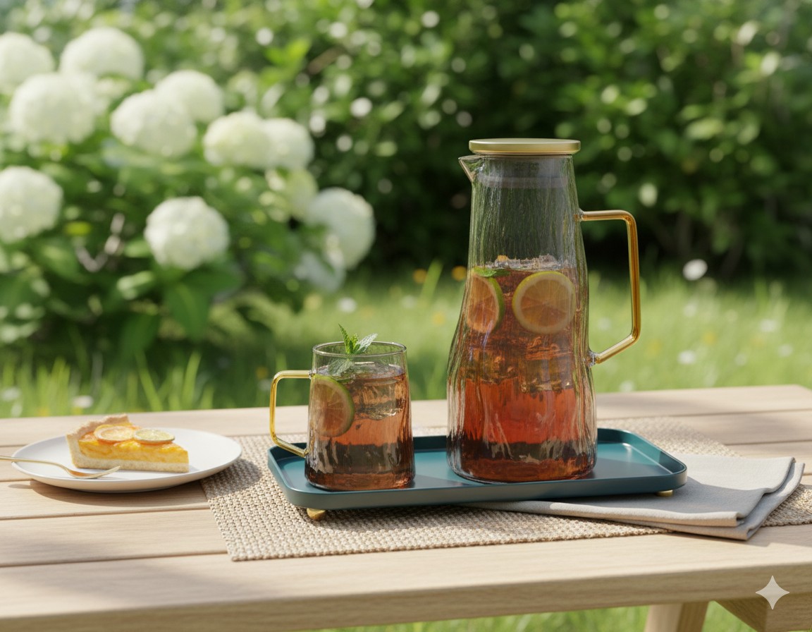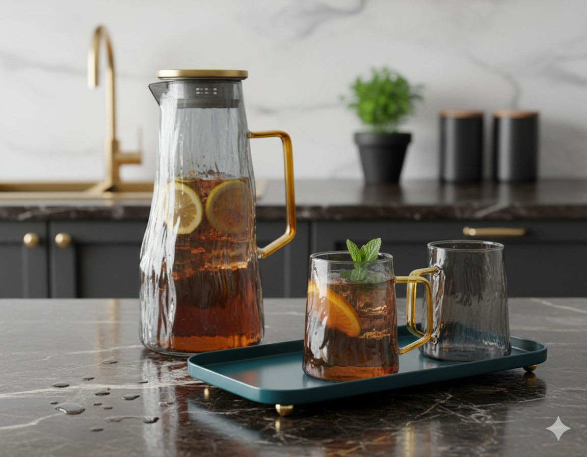 Glass drink set with gold-plated handle and serving tray with distinctive sequoia pattern, code GX-43-S