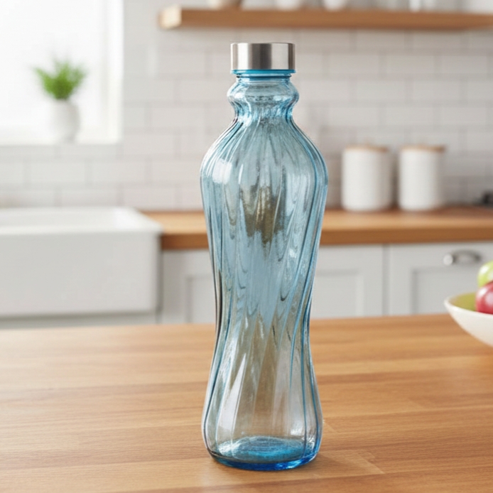 Glass Water Bottle, Blue Glass Spiral Design Round Shape Silver Lid - abdo-201-215
