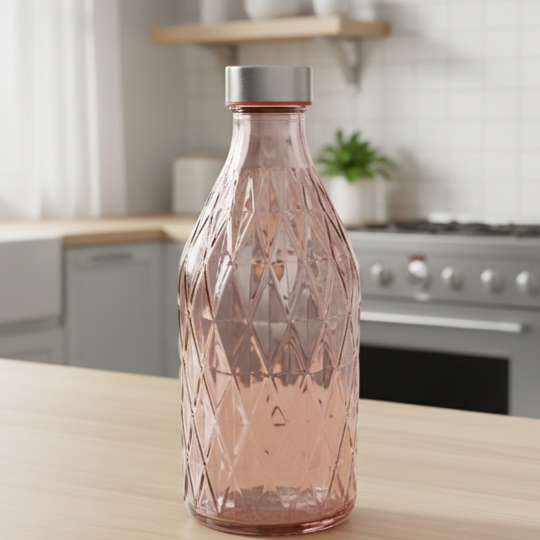 Glass Water Bottle, Burgundy Embossed Pattern Round Shape, Silver Lid - abdo-201-219