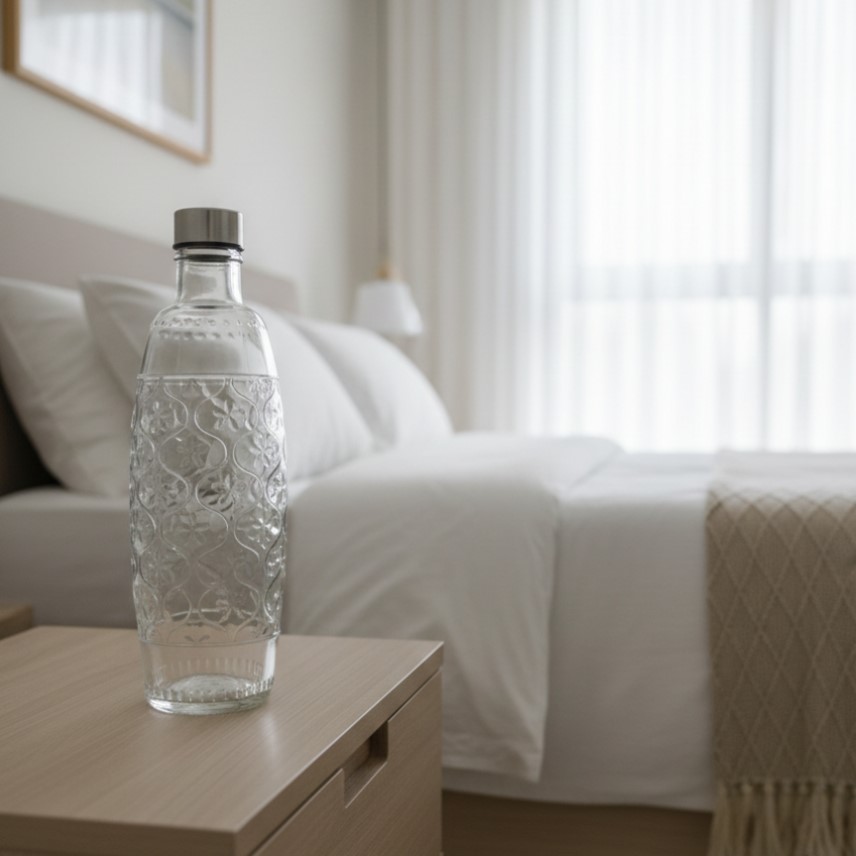 Glass water bottle, white, printed design, round shape, silver lid - abdo - 210 - 45 A