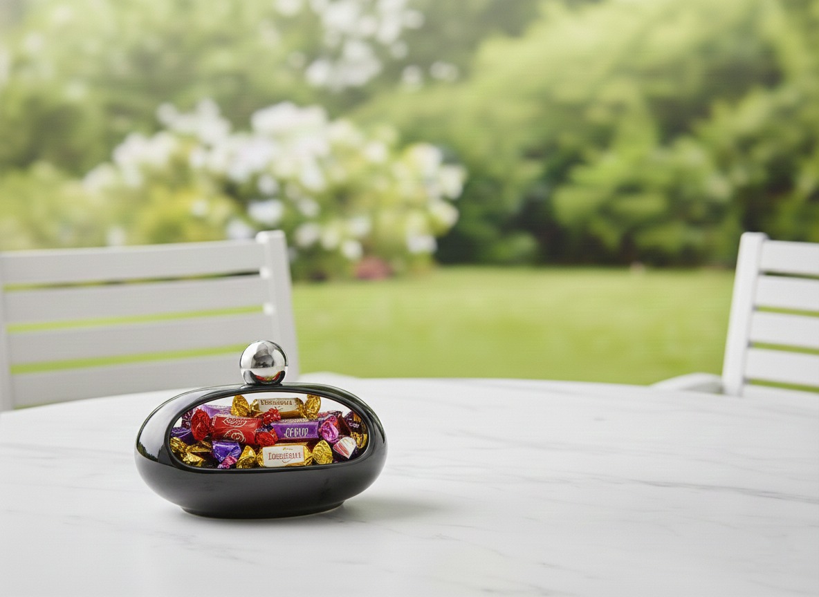 Bonbonniere, glossy black, oval shape with a hollow modern design, ideal for serving sweets.