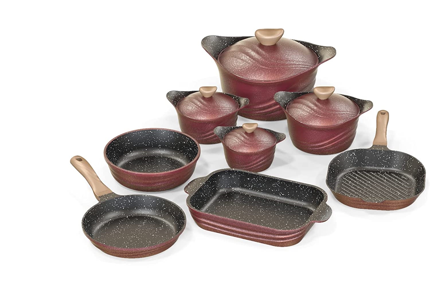 Nice Cooker Granite Set 12 Pieces, consisting of 4 Pots (18-20-24-32), a 30 cm Grill, a 36 cm Tagine, a 28 cm Baking Tray, and a 26 cm Frying Pan