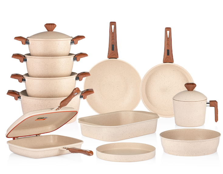 Granite Gigilli Cookware Set – 17 Pieces – 4 Pots (28-24-22-20 cm) + Roaster 35 cm + Frying Pan 26 cm + Oven Tray 28 cm + Wok 28 cm + Pizza Tray 28 cm + Double Grill 36 cm + Milk Pot 16 cm – Beige