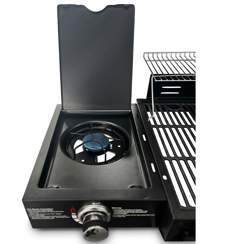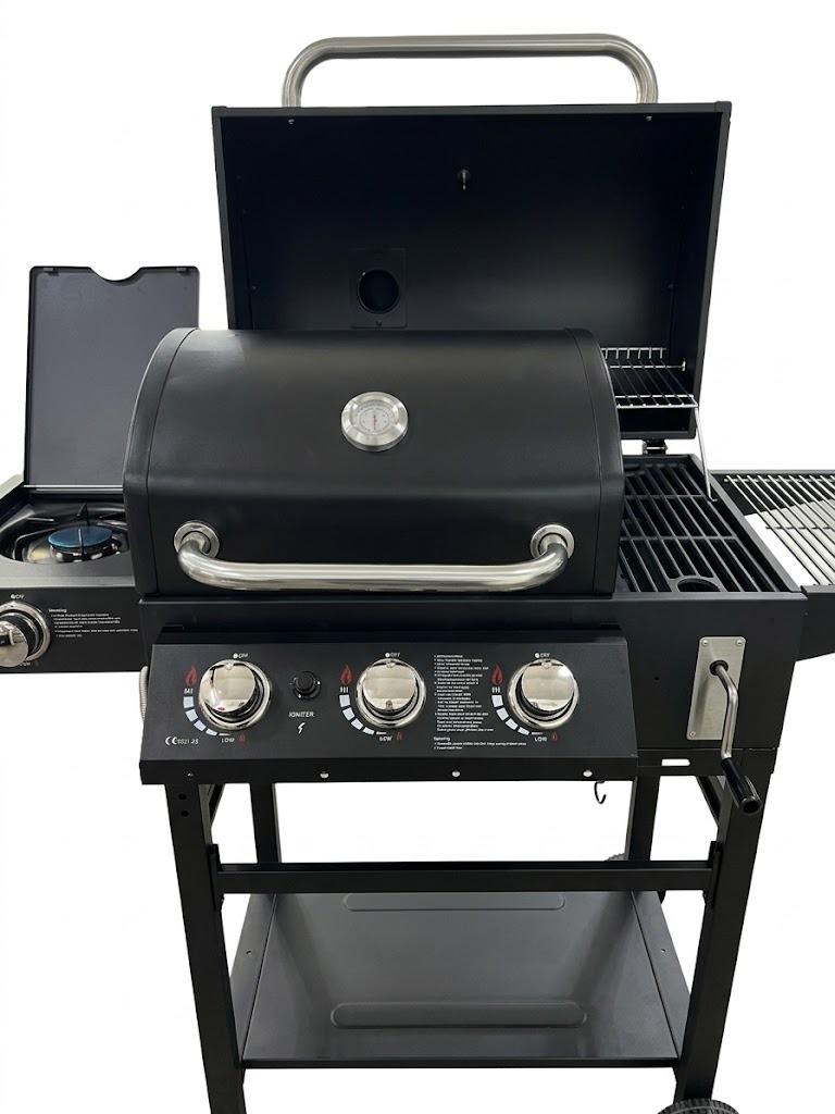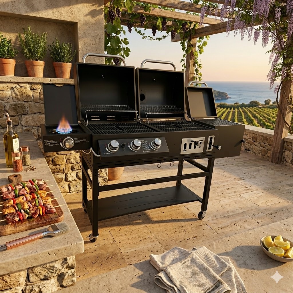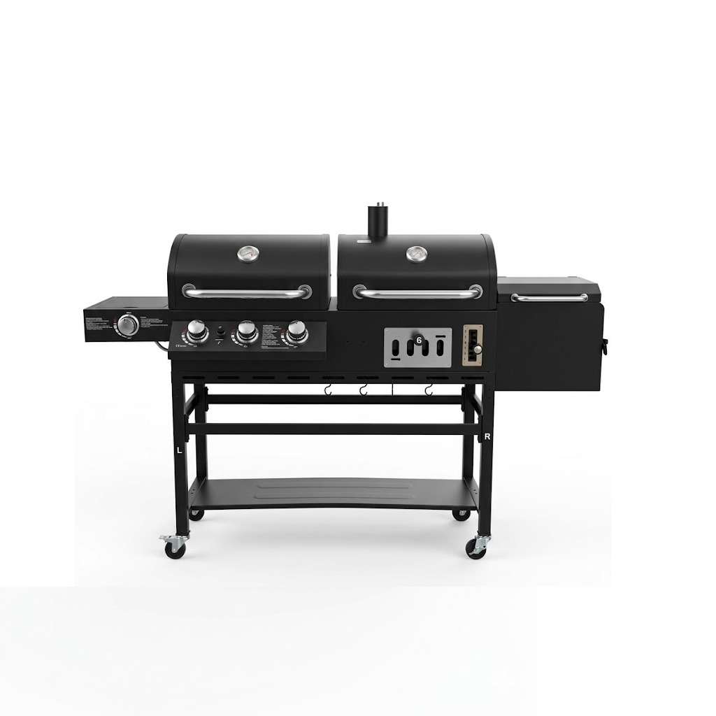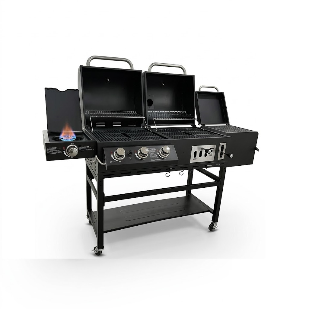 Hyper Techno Grill (Charcoal + Gas) – Advanced model with a side smoker and ultra-durable steel body, giant size 195×65×137 cm